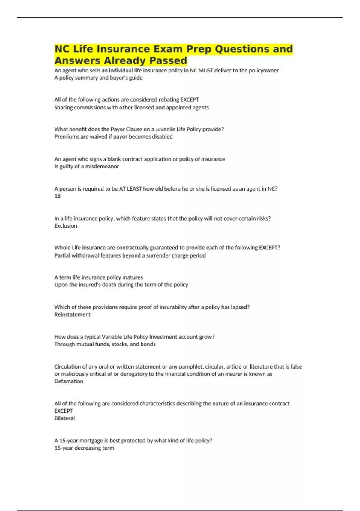 NC Life Insurance Exam Prep Questions and Answers Already Passed |A+ GRADED!!!