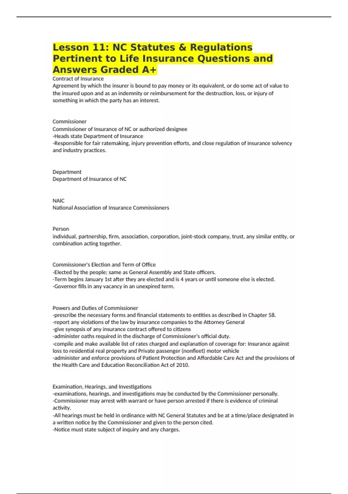 Lesson 11: NC Statutes & Regulations Pertinent to Life Insurance Questions and Answers Graded A+ |100% Complete