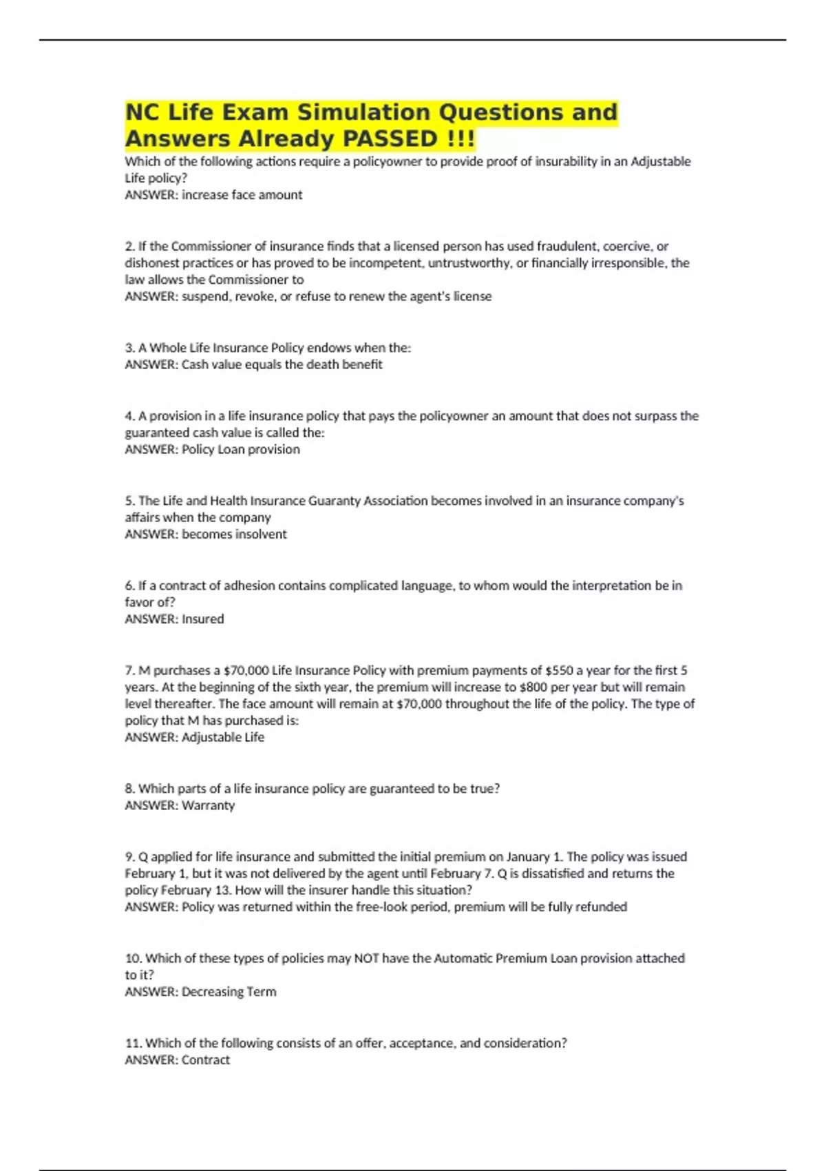 NC Life Exam Simulation Questions and Answers Already PASSED !!! Which of the following actions require a policyowner to provide proof of insurability in an Adjustable Life policy? ANSWER: increase face amount 2. If the Commissioner of insurance finds that a licensed person has used fraudulent, coercive, or dishonest practices or has proved to be incompetent, untrustworthy, or financially irresponsible, the law allows the Commissioner to ANSWER: suspend, revoke, or refuse to renew the agent's license 3. A Whole Life Insurance Policy endows when the: ANSWER: Cash value equals the death benefit 4. A provision in a life insurance policy that pays the policyowner an amount that does not surpass the guaranteed cash value is called the: ANSWER: Policy Loan provision 5. The Life and Health Insurance Guaranty Association becomes involved in an insurance company's affairs when the company ANSWER: becomes insolvent 6. If a contract of adhesion contains complicated language, to whom would the interpretation be in favor of? ANSWER: Insured 7. M purchases a $70,000 Life Insurance Policy with premium payments of $550 a year for the first 5 years. At the beginning of the sixth year, the premium will increase to $800 per year but will remain level thereafter. The face amount will remain at $70,000 throughout the life of the policy. The type of policy that M has purchased is: ANSWER: Adjustable Life 8. Which parts of a life insurance policy are guaranteed to be true? ANSWER: Warranty 9. Q applied for life insurance and submitted the initial premium on January 1. The policy was issued February 1, but it was not delivered by the agent until February 7. Q is dissatisfied and returns the policy February 13. How will the insurer handle this situation? ANSWER: Policy was returned within the free-look period, premium will be fully refunded 10. Which of these types of policies may NOT have the Automatic Premium Loan provision attached to it? ANSWER: Decreasing Term 11. Which of the following consists of an offer, acceptance, and consideration?