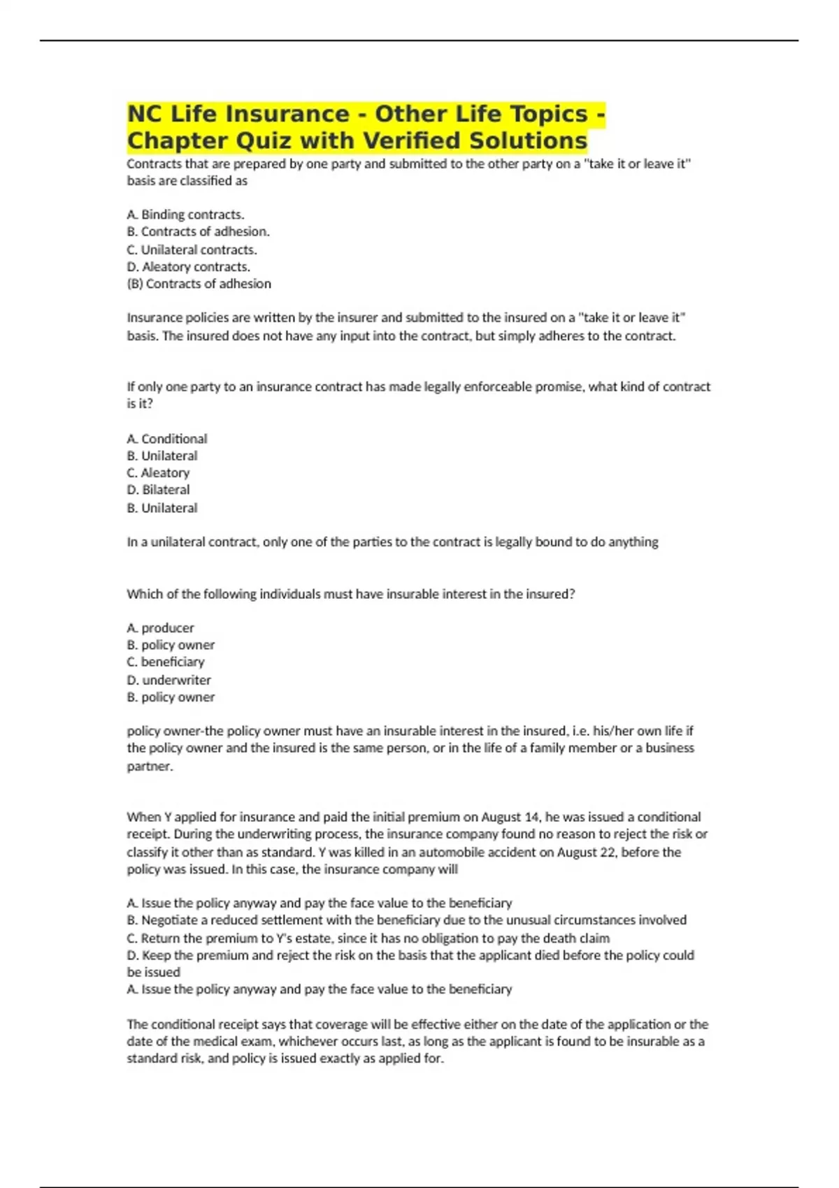 NC Life Insurance - Other Life Topics - Chapter Quiz with Verified Solutions Contracts that are prepared by one party and submitted to the other party on a "take it or leave it" basis are classified as A. Binding contracts. B. Contracts of adhesion. C. Unilateral contracts. D. Aleatory contracts. (B) Contracts of adhesion Insurance policies are written by the insurer and submitted to the insured on a "take it or leave it" basis. The insured does not have any input into the contract, but simply adheres to the contract. If only one party to an insurance contract has made legally enforceable promise, what kind of contract is it? A. Conditional B. Unilateral C. Aleatory D. Bilateral B. Unilateral In a unilateral contract, only one of the parties to the contract is legally bound to do anything Which of the following individuals must have insurable interest in the insured? A. producer B. policy owner C. beneficiary D. underwriter B. policy owner policy owner-the policy owner must have an insurable interest in the insured, i.e. his/her own life if the policy owner and the insured is the same person, or in the life of a family member or a business partner. When Y applied for insurance and paid the initial premium on August 14, he was issued a conditional receipt. During the underwriting process, the insurance company found no reason to reject the risk or classify it other than as standard. Y was killed in an automobile accident on August 22, before the policy was issued. In this case, the insurance company will A. Issue the policy anyway and pay the face value to the beneficiary B. Negotiate a reduced settlement with the beneficiary due to the unusual circumstances involved C. Return the premium to Y's estate, since it has no obligation to pay the death claim D. Keep the premium and reject the risk on the basis that the applicant died before the policy could be issued A. Issue the policy anyway and pay the face value to the beneficiary The conditional receipt says that coverage will be effective either on the date of the application or the date of the medical exam, whichever occurs last, as long as the applicant is found to be insurable as a standard risk, and policy is issued exactly as applied for.