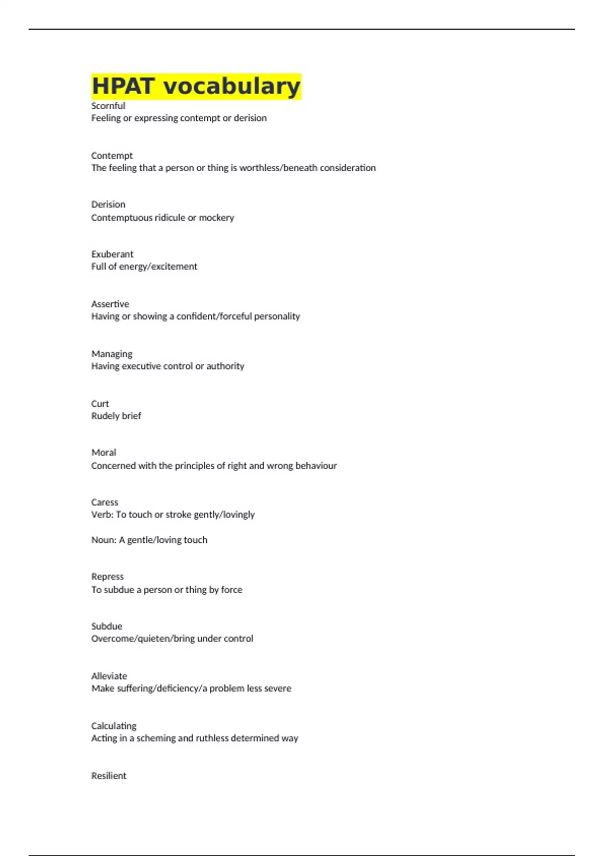 HPAT vocabulary Scornful Feeling or expressing contempt or derision Contempt The feeling that a person or thing is worthless/beneath consideration Derision Contemptuous ridicule or mockery Exuberant Full of energy/excitement Assertive Having or showing a confident/forceful personality Managing Having executive control or authority Curt Rudely brief Moral Concerned with the principles of right and wrong behaviour Caress Verb: To touch or stroke gently/lovingly Noun: A gentle/loving touch Repress To subdue a person or thing by force Subdue Overcome/quieten/bring under control Alleviate Make suffering/deficiency/a problem less severe Calculating Acting in a scheming and ruthless determined way