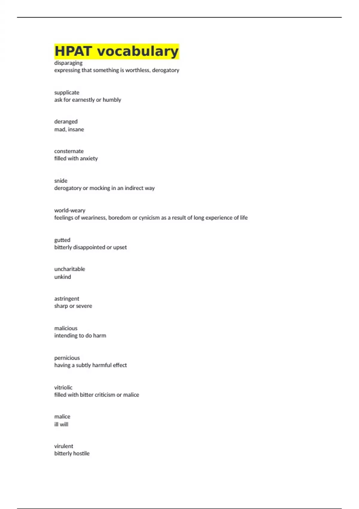 HPAT vocabulary disparaging expressing that something is worthless, derogatory supplicate ask for earnestly or humbly deranged mad, insane consternate filled with anxiety snide derogatory or mocking in an indirect way world-weary feelings of weariness, boredom or cynicism as a result of long experience of life gutted bitterly disappointed or upset uncharitable unkind astringent sharp or severe malicious intending to do harm pernicious having a subtly harmful effect vitriolic filled with bitter criticism or malice malice ill will virulent bitterly hostile