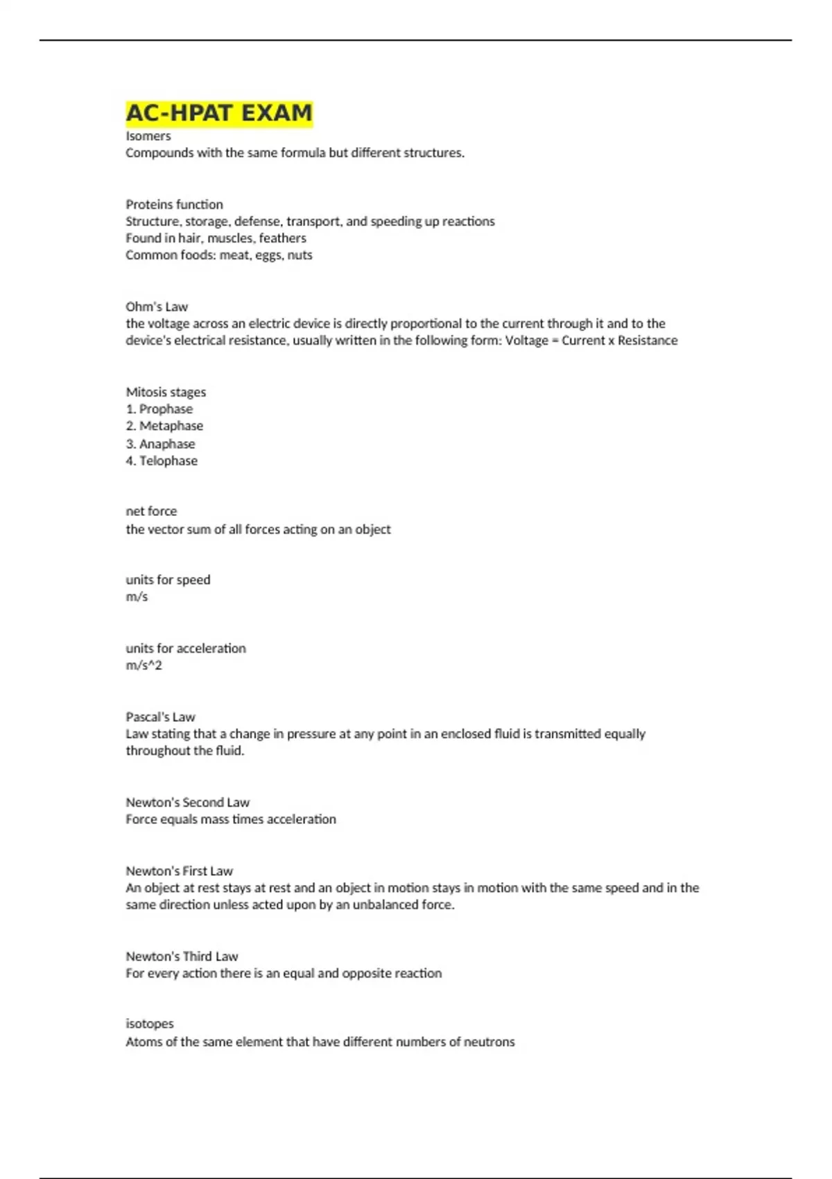 AC-HPAT EXAM Isomers Compounds with the same formula but different structures. Proteins function Structure, storage, defense, transport, and speeding up reactions Found in hair, muscles, feathers Common foods: meat, eggs, nuts Ohm's Law the voltage across an electric device is directly proportional to the current through it and to the device's electrical resistance, usually written in the following form: Voltage = Current x Resistance Mitosis stages 1. Prophase 2. Metaphase 3. Anaphase 4. Telophase net force the vector sum of all forces acting on an object units for speed m/s units for acceleration m/s^2 Pascal's Law Law stating that a change in pressure at any point in an enclosed fluid is transmitted equally throughout the fluid. Newton's Second Law Force equals mass times acceleration Newton's First Law An object at rest stays at rest and an object in motion stays in motion with the same speed and in the same direction unless acted upon by an unbalanced force. Newton's Third Law For every action there is an equal and opposite reaction isotopes Atoms of the same element that have different numbers of neutrons