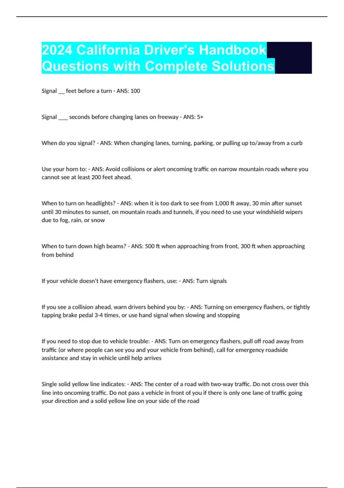 2024 California Driver's Handbook Questions with Complete Solutions Signal __ feet before a turn - ANS: 100 Signal ___ seconds before changing lanes on freeway - ANS: 5+ When do you signal? - ANS: When changing lanes, turning, parking, or pulling up to/away from a curb Use your horn to: - ANS: Avoid collisions or alert oncoming traffic on narrow mountain roads where you cannot see at least 200 feet ahead. When to turn on headlights? - ANS: when it is too dark to see from 1,000 ft away, 30 min after sunset until 30 minutes to sunset, on mountain roads and tunnels, if you need to use your windshield wipers due to fog, rain, or snow When to turn down high beams? - ANS: 500 ft when approaching from front, 300 ft when approaching from behind If your vehicle doesn't have emergency flashers, use: - ANS: Turn signals If you see a collision ahead, warn drivers behind you by: - ANS: Turning on emergency flashers, or tightly tapping brake pedal 3-4 times, or use hand signal when slowing and stopping If you need to stop due to vehicle trouble: - ANS: Turn on emergency flashers, pull off road away from traffic (or where people can see you and your vehicle from behind), call for emergency roadside assistance and stay in vehicle until help arrives Single solid yellow line indicates: - ANS: The center of a road with two-way traffic. Do not cross over this line into oncoming traffic. Do not pass a vehicle in front of you if there is only one lane of traffic going your direction and a solid yellow line on your side of the road Solid double yellow lines indicates: - ANS: No passing from either side Two sets of solid, double, yellow lines that are two or more feet apart indicates: - ANS: A barrier. Do not drive on or over this barrier, make a left turn, or make a U-turn across it. Broken yellow line indicates: - ANS: You may pass if the broken line is next to your driving lane and when it is safe. Single solid white line indicates: - ANS: Traffic lanes going in the same direction, including one-way streets Double solid white lines indicates: - ANS: Lane barrier between regular and preferential use lane (e.g. carpool lane). Never change lanes over these lines, wait for single broken white line. Broken white lines indicates: - ANS: Separation of traffic lanes on roads with 2+ lanes in the same direction What do end of lane markings look like? - ANS: Large broken lines What do yield lines look like? - ANS: A solid white line of triangles pointing towards approaching vehicles.
