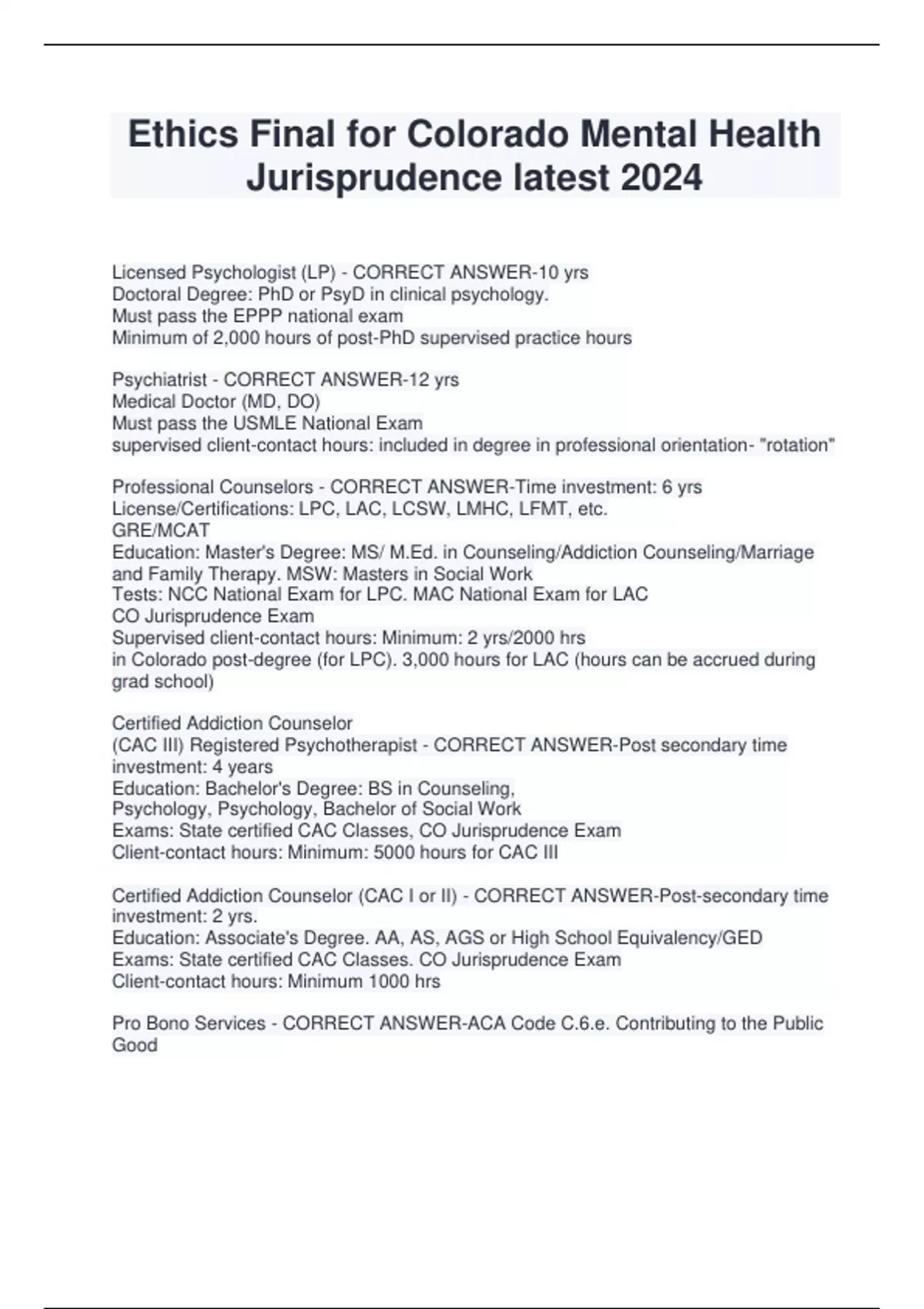 Ethics Final for Colorado Mental Health Jurisprudence latest 2024 Licensed Psychologist (LP) - CORRECT ANSWER-10 yrs Doctoral Degree: PhD or PsyD in clinical psychology. Must pass the EPPP national exam Minimum of 2,000 hours of post-PhD supervised practice hours Psychiatrist - CORRECT ANSWER-12 yrs Medical Doctor (MD, DO) Must pass the USMLE National Exam supervised client-contact hours: included in degree in professional orientation- "rotation" Professional Counselors - CORRECT ANSWER-Time investment: 6 yrs License/Certifications: LPC, LAC, LCSW, LMHC, LFMT, etc. GRE/MCAT Education: Master's Degree: MS/ M.Ed. in Counseling/Addiction Counseling/Marriage and Family Therapy. MSW: Masters in Social Work Tests: NCC National Exam for LPC. MAC National Exam for LAC CO Jurisprudence Exam Supervised client-contact hours: Minimum: 2 yrs/2000 hrs in Colorado post-degree (for LPC). 3,000 hours for LAC (hours can be accrued during grad school) Certified Addiction Counselor (CAC III) Registered Psychotherapist - CORRECT ANSWER-Post secondary time investment: 4 years Education: Bachelor's Degree: BS in Counseling, Psychology, Psychology, Bachelor of Social Work Exams: State certified CAC Classes, CO Jurisprudence Exam Client-contact hours: Minimum: 5000 hours for CAC III Certified Addiction Counselor (CAC I or II) - CORRECT ANSWER-Post-secondary time investment: 2 yrs. Education: Associate's Degree. AA, AS, AGS or High School Equivalency/GED Exams: State certified CAC Classes. CO Jurisprudence Exam Client-contact hours: Minimum 1000 hrs Pro Bono Services - CORRECT ANSWER-ACA Code C.6.e. Contributing to the Public Good