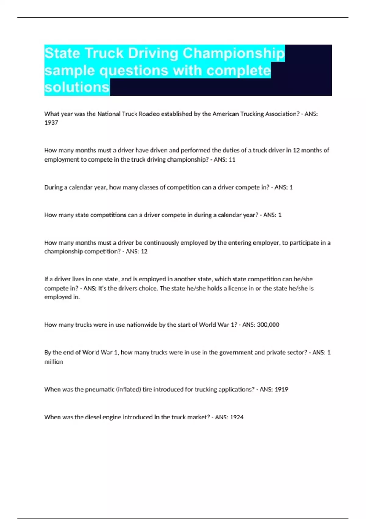 State Truck Driving Championship sample questions with complete solutions What year was the National Truck Roadeo established by the American Trucking Association? - ANS: 1937 How many months must a driver have driven and performed the duties of a truck driver in 12 months of employment to compete in the truck driving championship? - ANS: 11 During a calendar year, how many classes of competition can a driver compete in? - ANS: 1 How many state competitions can a driver compete in during a calendar year? - ANS: 1 How many months must a driver be continuously employed by the entering employer, to participate in a championship competition? - ANS: 12 If a driver lives in one state, and is employed in another state, which state competition can he/she compete in? - ANS: It's the drivers choice. The state he/she holds a license in or the state he/she is employed in. How many trucks were in use nationwide by the start of World War 1? - ANS: 300,000 By the end of World War 1, how many trucks were in use in the government and private sector? - ANS: 1 million When was the pneumatic (inflated) tire introduced for trucking applications? - ANS: 1919 When was the diesel engine introduced in the truck market? - ANS: 1924 What year was the Motor Carrier Act passed? - ANS: 1935 What year was the Interstate Commerce Act passed? - ANS: 1887 What year did Dwight D. Eisenhower sign the landmark Federal Highway-Aid Act, establishing the interstate highway system? - ANS: 1956 D.O.T. was established by an act of congress on what date? - ANS: October 15, 1966 In 1967, control over interstate motor safety, including regulations, was transferred to the then newly created ______________. - ANS: U.S. Department of Transportation Between 1980 and 1990, the number of licensed motor carriers more than doubled to over _____. - ANS: 40,000 Today, there are nearly _____ for hire and private motor carriers doing business in the United States. - ANS: 1.3 million The Commercial Motor Vehicle Safety Act was passed by congress in what year? - ANS: 1986 In _____, the Interstate Commerce Commission was formerly abolished. - ANS: 1995