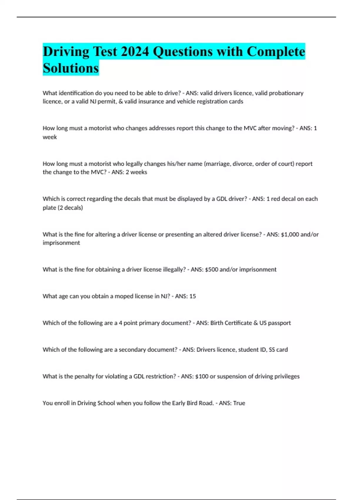 Driving Test 2024 Questions with Complete Solutions What identification do you need to be able to drive? - ANS: valid drivers licence, valid probationary licence, or a valid NJ permit, & valid insurance and vehicle registration cards How long must a motorist who changes addresses report this change to the MVC after moving? - ANS: 1 week How long must a motorist who legally changes his/her name (marriage, divorce, order of court) report the change to the MVC? - ANS: 2 weeks Which is correct regarding the decals that must be displayed by a GDL driver? - ANS: 1 red decal on each plate (2 decals) What is the fine for altering a driver license or presenting an altered driver license? - ANS: $1,000 and/or imprisonment What is the fine for obtaining a driver license illegally? - ANS: $500 and/or imprisonment What age can you obtain a moped license in NJ? - ANS: 15 Which of the following are a 4 point primary document? - ANS: Birth Certificate & US passport Which of the following are a secondary document? - ANS: Drivers licence, student ID, SS card What is the penalty for violating a GDL restriction? - ANS: $100 or suspension of driving privileges You enroll in Driving School when you follow the Early Bird Road. - ANS: True