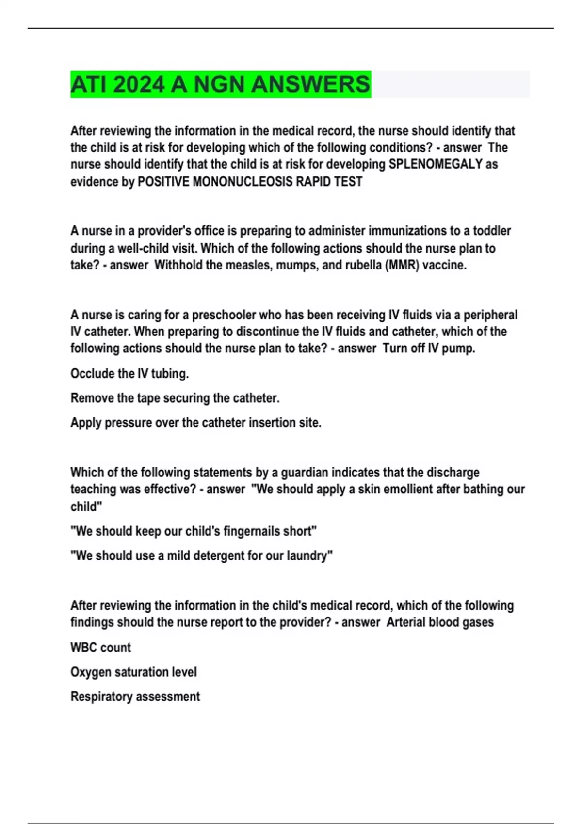After reviewing the information in the medical record, the nurse should identify that the child is at risk for developing which of the following conditions? The nurse should identify that the child is at risk for developing SPLENOMEGALY as evidence by POSITIVE MONONUCLEOSIS RAPID TEST A nurse in a provider's office is preparing to administer immunizations to a toddler during a well-child visit. Which of the following actions should the nurse plan to take? Withhold the measles, mumps, and rubella (MMR) vaccine. A nurse is caring for a preschooler who has been receiving IV fluids via a peripheral IV catheter. When preparing to discontinue the IV fluids and catheter, which of the following actions should the nurse plan to take? Turn off IV pump. Occlude the IV tubing. Remove the tape securing the catheter. Apply pressure over the catheter insertion site. Which of the following statements by a guardian indicates that the discharge teaching was effective? "We should apply a skin emollient after bathing our child" "We should keep our child's fingernails short" "We should use a mild detergent for our laundry" After reviewing the information in the child's medical record, which of the following findings should the nurse report to the provider? Arterial blood gases WBC count Oxygen saturation level Respiratory assessment The nurse should identify that which of the following findings require immediate follow-up? Partial- and full-thickness burns to the left upper anterior chest and anterior neck. SaO2 89% on room air. Heart rate 150/min. Which of the following potential prescriptions should the nurse identify as anticipated or contraindicated? Contraindicated: Apply sterile gauze soaked with cool 0.9% sodium chloride to the burn areas. Indicated: Insert indwelling urinary catheter. Provide 100% oxygen via face mask. Weigh the child. After reviewing the child's assessment, which of the following findings should the nurse address first? The nurse should first address the client's TEMPERATURE followed by the client's PAIN After examining the child during hydrotherapy, the provider enters prescriptions into the child's medical record. Anticipated: Change the morphine route to family-controlled analgesia via a PCA pump. Obtain a wound culture. Place the child on a pressure-reduction mattress. Contraindicated: Limit daily protein. The child has returned to the unit following the procedure. Which of the following actions should the nurse take? Provide 100% oxygen via face mask. Check anterior neck and chest dressing for bleeding. Place a warm blanket on the child. Keep the child's head in a neutral position. Select 6 statements by the parent that indicate an understanding of the discharge teaching. "I should apply a moisturizer to the scar tissue" "I will use a measured spoon or medicine cup to give my child hydroxyzine" "I can give my child hydroxyzine every 6 hours as needed" "Puppet play can be helpful for my child" "I need to assess for any redness or open skin areas before applying my child's left arm splint" "My child will need to use a compression garment to decrease blood supply to the scarred tissue"