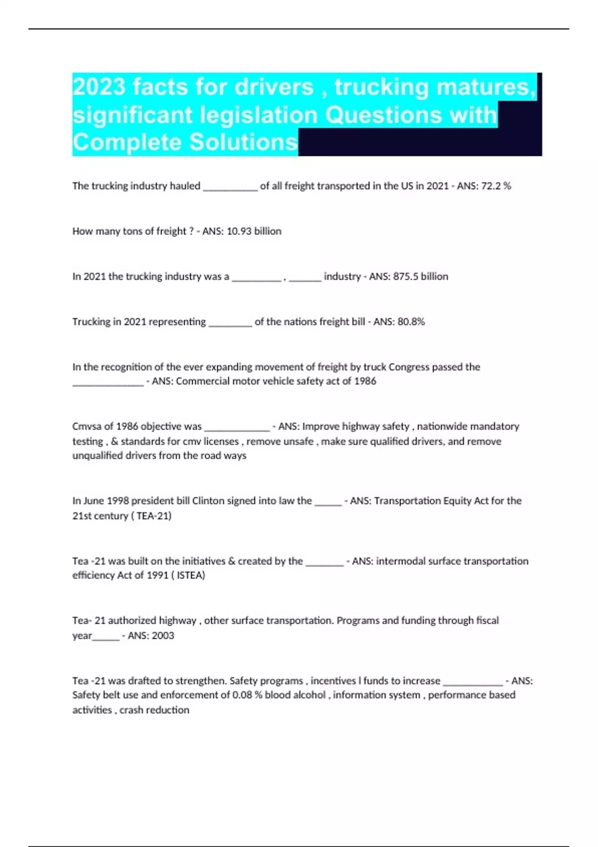 2023 facts for drivers , trucking matures, significant legislation Questions with Complete Solutions The trucking industry hauled __________ of all freight transported in the US in 2021 - ANS: 72.2 % How many tons of freight ? - ANS: 10.93 billion In 2021 the trucking industry was a _________ , ______ industry - ANS: 875.5 billion Trucking in 2021 representing ________ of the nations freight bill - ANS: 80.8% In the recognition of the ever expanding movement of freight by truck Congress passed the _____________ - ANS: Commercial motor vehicle safety act of 1986 Cmvsa of 1986 objective was ____________ - ANS: Improve highway safety , nationwide mandatory testing , & standards for cmv licenses , remove unsafe , make sure qualified drivers, and remove unqualified drivers from the road ways In June 1998 president bill Clinton signed into law the _____ - ANS: Transportation Equity Act for the 21st century ( TEA-21) Tea -21 was built on the initiatives & created by the _______ - ANS: intermodal surface transportation efficiency Act of 1991 ( ISTEA) Tea- 21 authorized highway , other surface transportation. Programs and funding through fiscal year_____ - ANS: 2003 Tea -21 was drafted to strengthen. Safety programs , incentives l funds to increase ___________ - ANS: Safety belt use and enforcement of 0.08 % blood alcohol , information system , performance based activities , crash reduction What was restructure under tea - 21 - ANS: National motor carrier safety program ( NMCSP) What was established under the restructuring of NMCSP - ANS: Motor carrier safety assistance program ( MCSAP) MCSAP was established to______________ - ANS: Disperse funds for state enforcement of cmv safety and hazardous materials regulations , roadside inspections , shut down unfit carriers , enforce safety regulations , What is the maximum fine for all non record keeping violations of the safety regulations _______? - ANS: $ 10,000 MCSAP amended the definition of commercial vehicle to