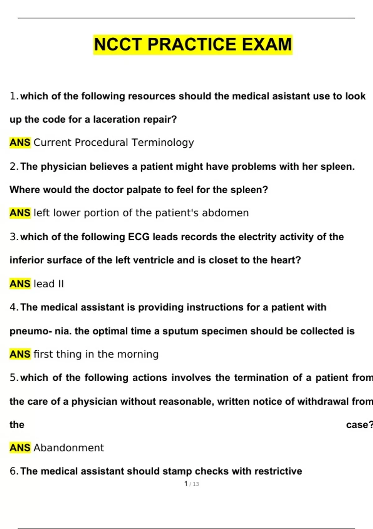 NCCT Practice Exam 2024 Questions with 100% Correct Answers | Updated | Download to score A+1. which of the following resources should the medical asistant use to look up the code for a laceration repair? ANS Current Procedural Terminology 2. The physician believes a patient might have problems with her spleen. Where would the doctor palpate to feel for the spleen? ANS left lower portion of the patient's abdomen 3. which of the following ECG leads records the electrity activity of the inferior surface of the left ventricle and is closet to the heart? ANS lead II 4. The medical assistant is providing instructions for a patient with pneumo- nia. the optimal time a sputum specimen should be collected is ANS first thing in the morning 5. which of the following actions involves the termination of a patient from the care of a physician without reasonable, written notice of withdrawal from the case? ANS Abandonment 6. The medical assistant should stamp checks with restrictive endorsement "for deposit only" to prevent ANS loss and theft 7. which of the following medical office software applications uses an elec- tronic signature? ANS EHR