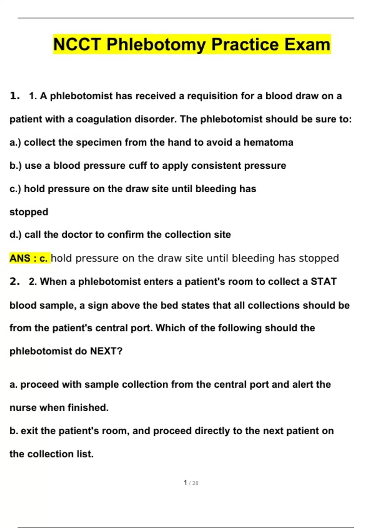 NCCT Phlebotomy Practice Exam 2024 Questions with 100% Correct Answers | Updated | Download to score A+ 1. 1. A phlebotomist has received a requisition for a blood draw on a patient with a coagulation disorder. The phlebotomist should be sure to: a.) collect the specimen from the hand to avoid a hematoma b.) use a blood pressure cuff to apply consistent pressure c.) hold pressure on the draw site until bleeding has stopped d.) call the doctor to confirm the collection site ANS : c. hold pressure on the draw site until bleeding has stopped 2. 2. When a phlebotomist enters a patient's room to collect a STAT blood sample, a sign above the bed states that all collections should be from the patient's central port. Which of the following should the phlebotomist do NEXT? a. proceed with sample collection from the central port and alert the nurse when finished. b. exit the patient's room, and proceed directly to the next patient on the collection list. c. identify the patient and ask for confirmation that the sign is accurate before proceeding with the collection. d. communicate with the test order to the nursing staff and wait for one of them to collect the sample ANS : d. communicate with the test order to the nursing staff and wait for one of them to collect the sample