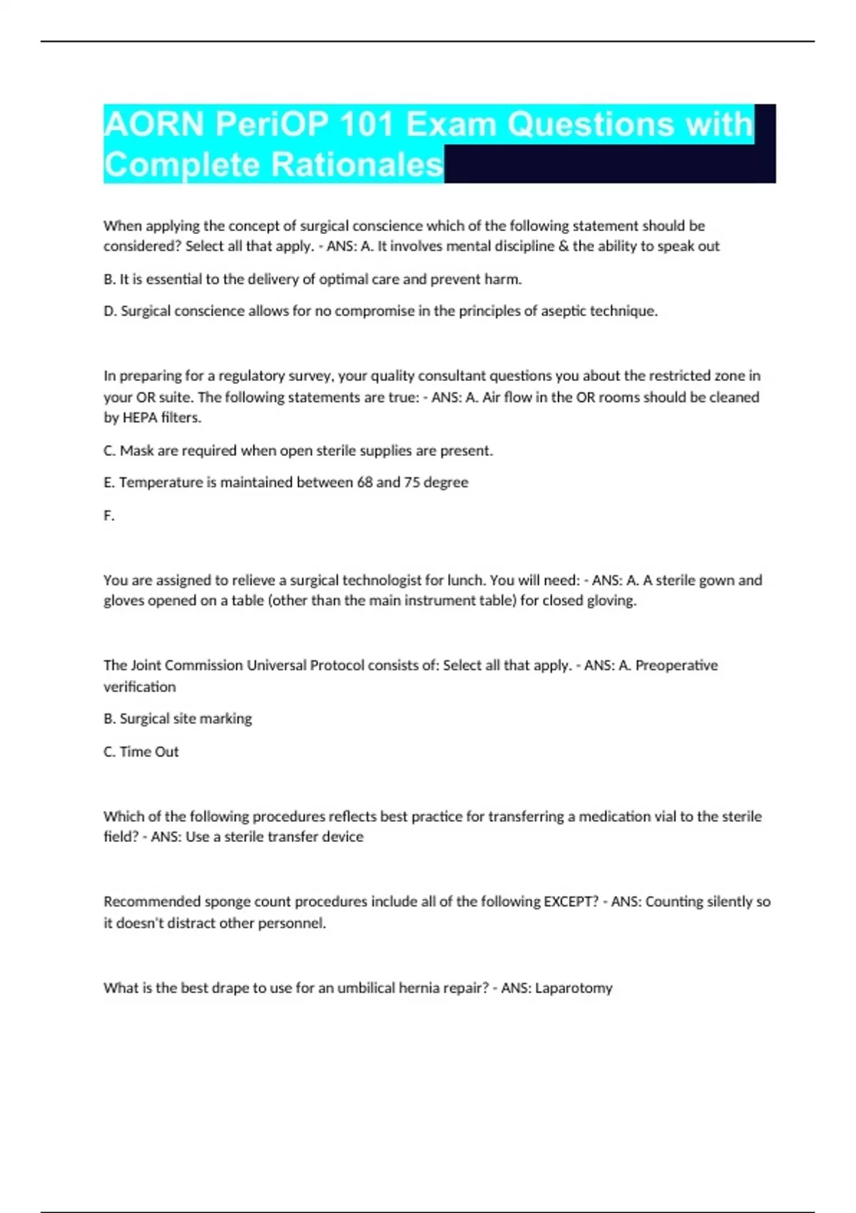 AORN PeriOP 101 Exam Questions with Complete Rationales