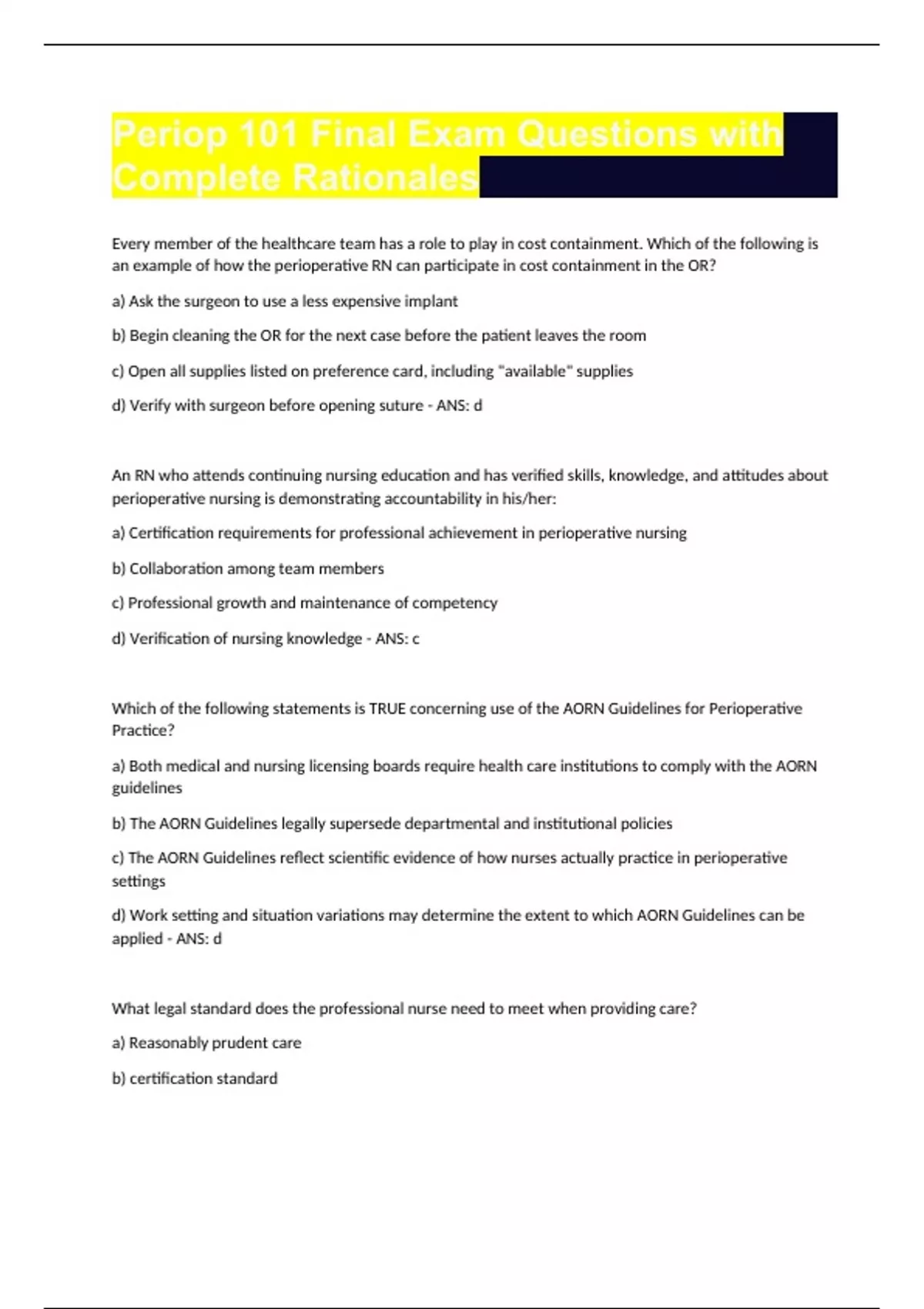Periop 101 Final Exam Questions with Complete Rationales Every member of the healthcare team has a role to play in cost containment. Which of the following is an example of how the perioperative RN can participate in cost containment in the OR? a) Ask the surgeon to use a less expensive implant b) Begin cleaning the OR for the next case before the patient leaves the room c) Open all supplies listed on preference card, including "available" supplies d) Verify with surgeon before opening suture - ANS: d An RN who attends continuing nursing education and has verified skills, knowledge, and attitudes about perioperative nursing is demonstrating accountability in his/her: a) Certification requirements for professional achievement in perioperative nursing b) Collaboration among team members c) Professional growth and maintenance of competency d) Verification of nursing knowledge - ANS: c Which of the following statements is TRUE concerning use of the AORN Guidelines for Perioperative Practice? a) Both medical and nursing licensing boards require health care institutions to comply with the AORN guidelines b) The AORN Guidelines legally supersede departmental and institutional policies c) The AORN Guidelines reflect scientific evidence of how nurses actually practice in perioperative settings d) Work setting and situation variations may determine the extent to which AORN Guidelines can be applied - ANS: d What legal standard does the professional nurse need to meet when providing care? a) Reasonably prudent care b) certification standard c) Reasonably responsible standard d) There is no legal standard - ANS: a a professional practice model includes personal accountability and ethical decision making. Which of the following is not part of personal accountability? a) Responsibility to self, patients, and peers b) Make decisions and accept consequences when necessary c) Accept performance input from direct and upper level management only d) Maintain professional engagement - ANS: c What would be the MOST important information for a nurse in Preadmission Testing (PAT) to collect on an insulin dependent diabetic patient? a. How long the patient has been diabetic b. If there is someone to deive them home c. The last time the patient ate or drank d. The type of insulin that patient takes - ANS: d After transferring a male pt into the Phase I PACU, the perioperative RN could reasonably expect the PACU RN to FIRST a. Administere med to the pt for nausea and vomiting b. Ask the pt if he has any pain c. Assess the pt's airway and respirations d. Care for this pt and 2 other pts as assigned - ANS: c During a handover report to the PACU RN, the perioperative RN may use a communication method identified by the acronym "SBAR". What does SBAR stand for? a. Safety, Background, Actions, Recovery expectations b. Situation, Background, Assessment, Recommendation - ANS: b A 40 yr old male pt is awake and alert in the PACU after a right shoulder surgery. What is the best measure to assess the pt's pain? a. Disucss the pt's pain with the anesthesiologist b. Observe facial expressions c. Ask the pt to rate pain from 1-10 d. Monitor vital sign changes - ANS: c A 47 yr old male is admitted to the Pre-op area for an inguinal hernia repair. What does the nurse include in the intake assessment? a. Pain b. Cognitive ability of the pt c. Cultural considerations d. All of the above - ANS: d During the preoperative interview, the perioperative nurse should ask pt's about their use of a. alcohol b. herbal preparations c. recreational drugs d. tobacco products e. all of the above - ANS: e The preoperative interview is the final assessment of the pt. This nurse-pt interaction enables the nurse to a. identify any additional pt care needs prior to surgery b. determine the length of the procedure and needed supplies c. introduce the pt to the surgical team d. provide info necessary for d/c - ANS: a Which assessment finding is common among elderly pts? a. An increase in oxygen saturation b. Decrease in vision including color and depth perception c. Increased perception of pain d. An easy adjustment to a change in their environment - ANS: b During the preoperative interview, the RN should ask the pt about use of any herbal preparations and/or botanicals. Why is this a critical component of the assessment? a. These products can affect bleeding times b. An alteration of medication metabolism can ensue c. Anesthetic toxicity can occur d. All of the above - ANS: d It is important to discuss the pt's spiritual needs during the pre-op assessment. What elements of different faiths should the periop nurse be aware of in the event of a pt's intraoperative death? a. Islamic beliefs include that one designated person should wash the body of the deceased b. The team should prepare for an organ donation for the deceased of any religious belief c. The RN circulator should immediately contact a local mortuary d. Cremation is preferred by memebers of the Jewish faith - ANS: a factors that may affect postoperative pain are: select all that apply a. The surgical site b. The nature and intended purpose of the surgery c. The pt's fears regarding anesthesia or surgery d. The level of anxiety of the pt's family members - ANS: a, b, c
