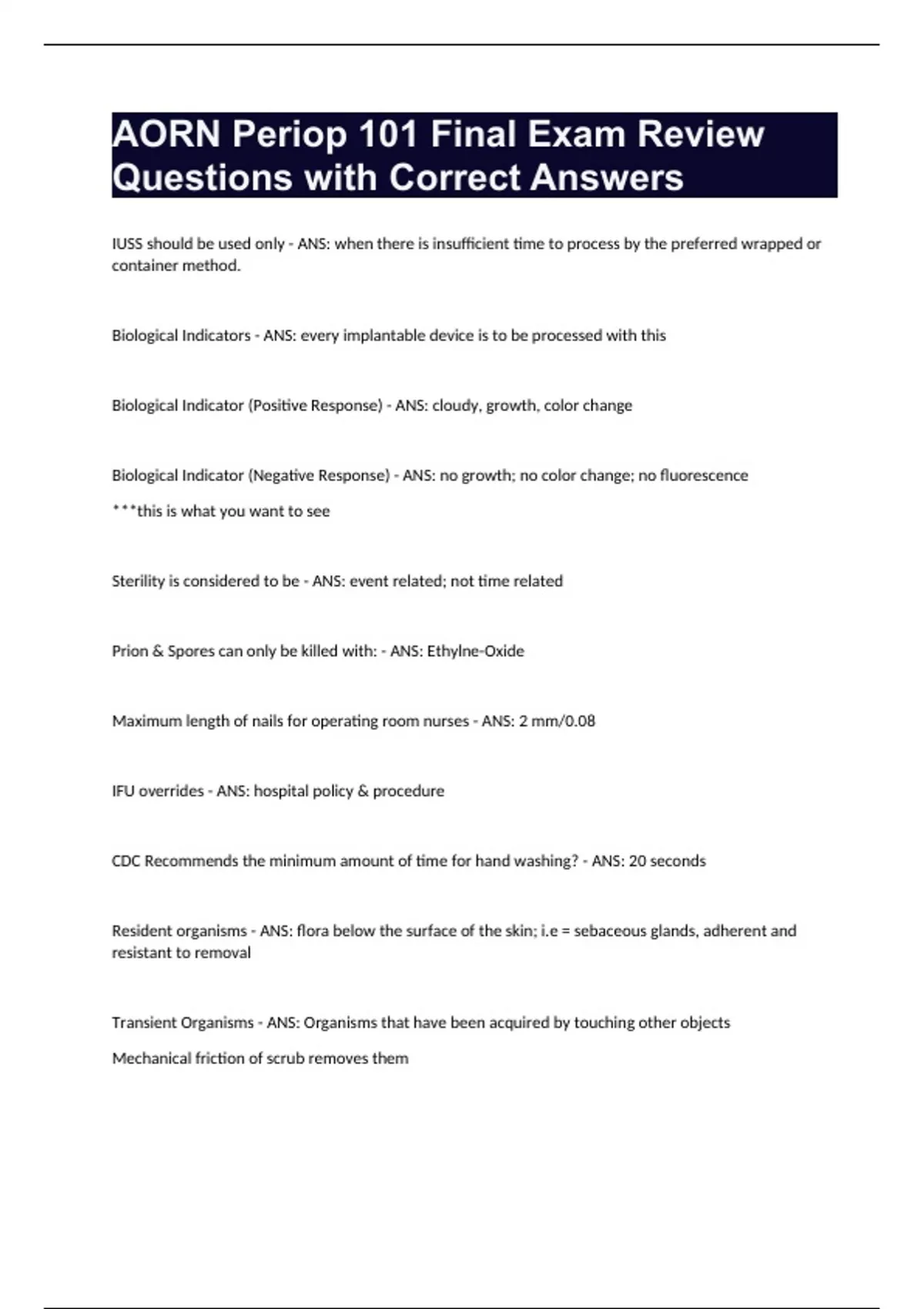 AORN Periop 101 Final Exam Review Questions with Correct Answers IUSS should be used only - ANS: when there is insufficient time to process by the preferred wrapped or container method. Biological Indicators - ANS: every implantable device is to be processed with this Biological Indicator (Positive Response) - ANS: cloudy, growth, color change Biological Indicator (Negative Response) - ANS: no growth; no color change; no fluorescence ***this is what you want to see Sterility is considered to be - ANS: event related; not time related Prion & Spores can only be killed with: - ANS: Ethylne-Oxide Maximum length of nails for operating room nurses - ANS: 2 mm/0.08 IFU overrides - ANS: hospital policy & procedure CDC Recommends the minimum amount of time for hand washing? - ANS: 20 seconds Resident organisms - ANS: flora below the surface of the skin; i.e = sebaceous glands, adherent and resistant to removal Transient Organisms - ANS: Organisms that have been acquired by touching other objects Mechanical friction of scrub removes them What is the maximum weight of a instrument tray? - ANS: 25 lbs Neutral zone is - ANS: a designated area on sterile field where scrub person and surgeon place all of the sharp instruments Why should the RN know the name of the instrument? - ANS: Because it helps nurses identify instruments during the count process Category of Wounds: Class I - ANS: clean Category of Wounds: Class II - ANS: Clean Contaminated Category of Wounds: Class III - ANS: Contaminated Category of Wounds: Class IV - ANS: Dirty or infected (necrotic tissue) Sterilization is: - ANS: complete elimination of all microorganisms What are the 4 parameters of sterilization? - ANS: steam saturation pressure temp time Peracetic acid - ANS: sterilization for immediate use; but cannot be stored To remove hair in the OR use? - ANS: clippers; NEVER RAZOR Where does the bovie pad go? - ANS: On a large well perfused muscle mass