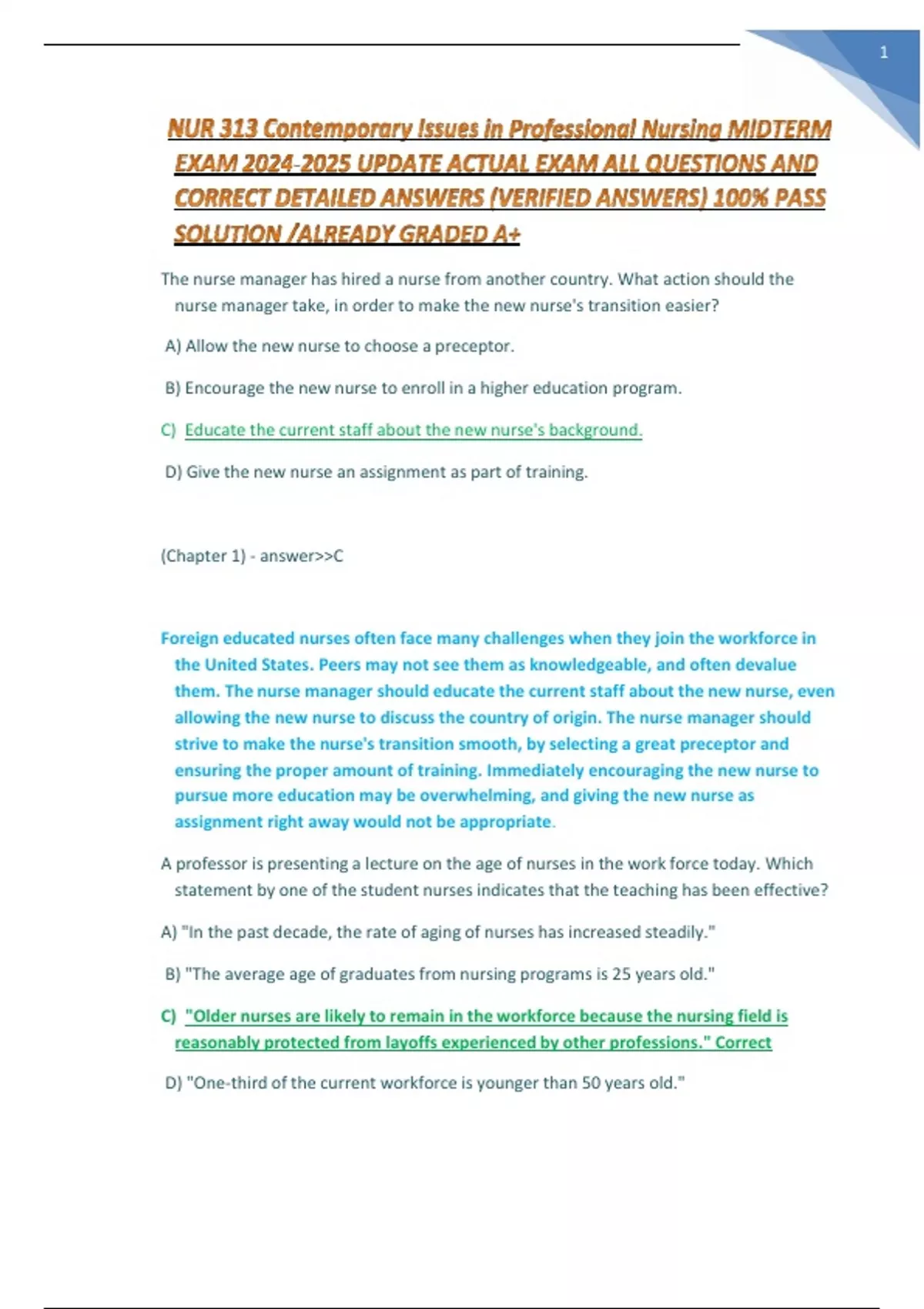 NUR 313 CONTEMPORARY ISSUES IN PROFESSIONAL NURSING MIDTERM EXAM UPDATE ACTUAL EXAM ALREADY GRADED A+