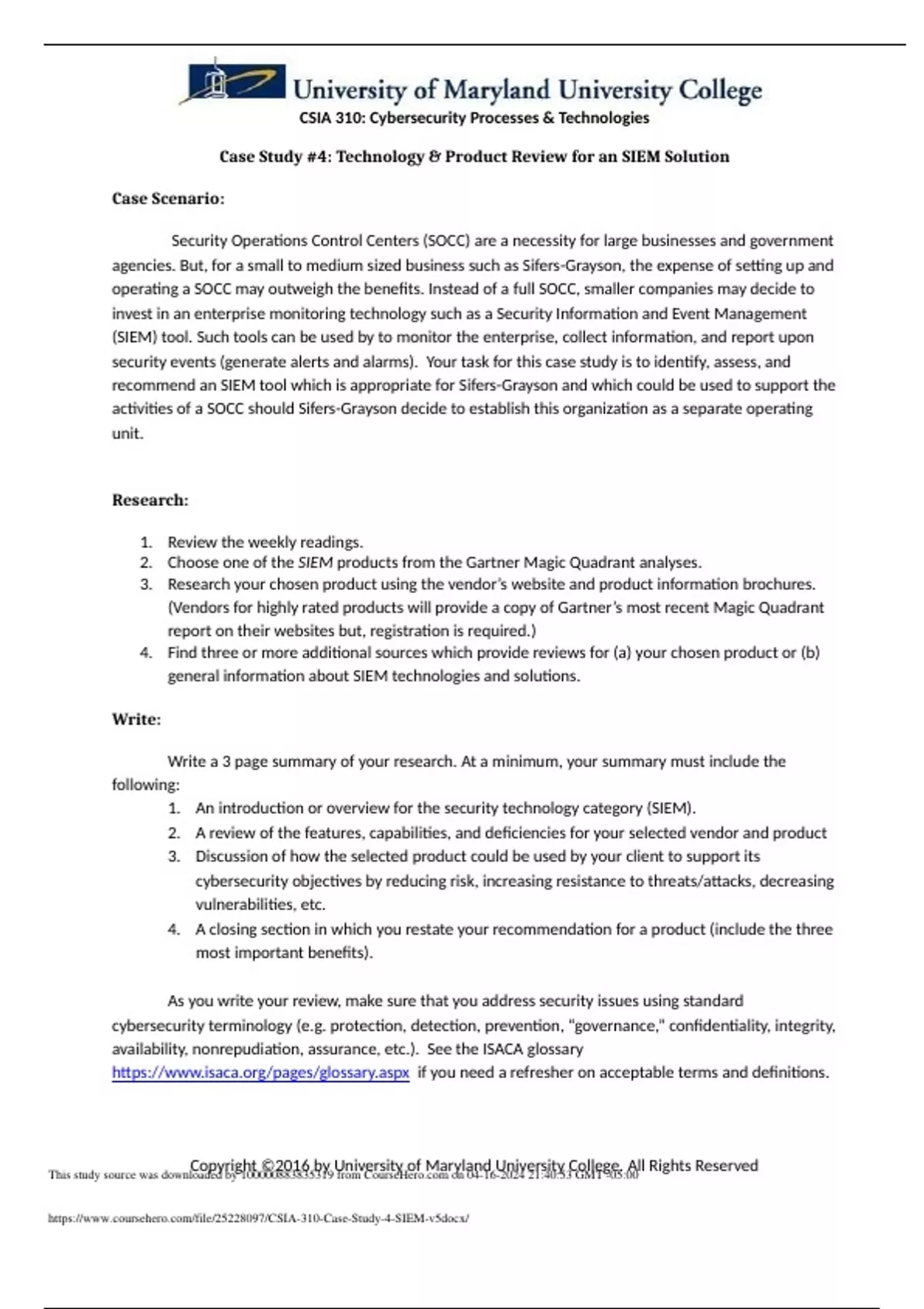 CSIA 310: Cybersecurity Processes & Technologies Case Study #4: Technology & Product Review for an SIEM Solution