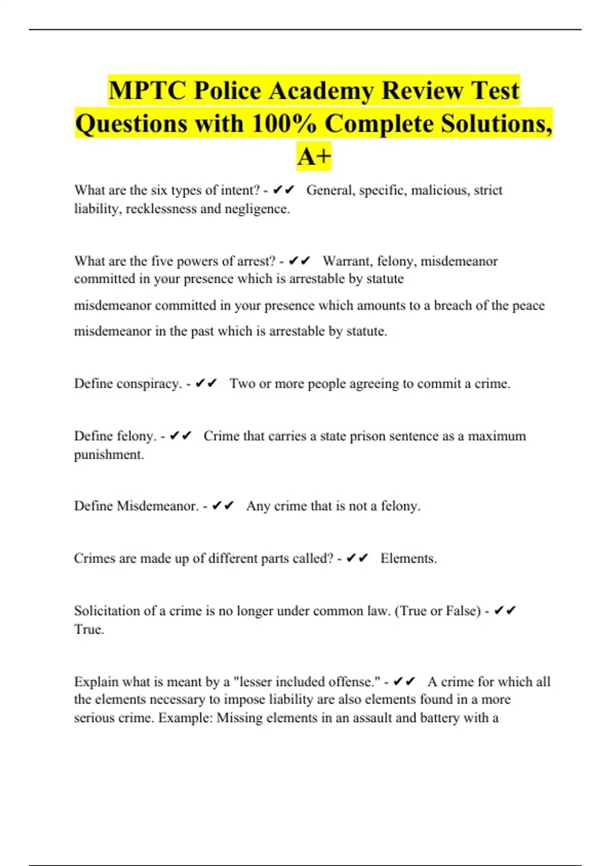 MPTC Police Academy Review Test Questions with 100% Complete Solutions, A+