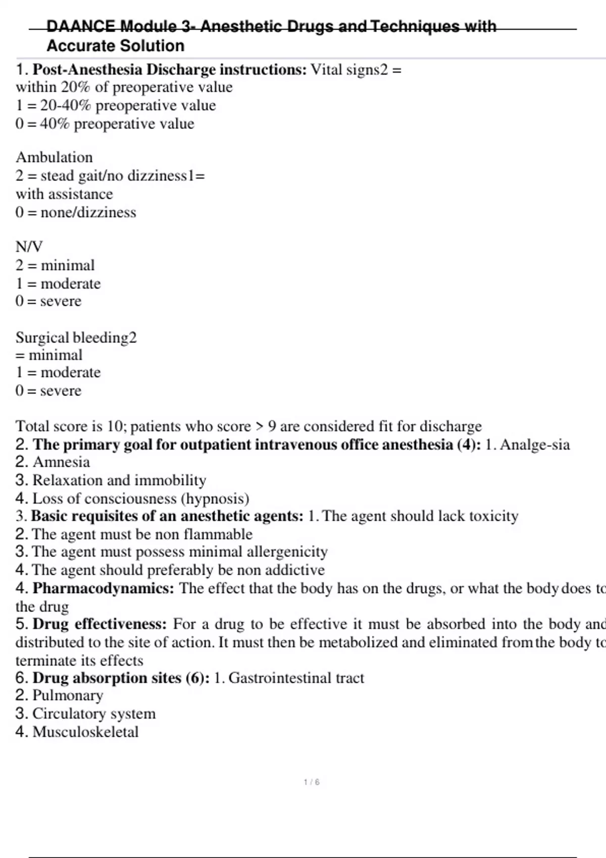 DAANCE Module 3- Anesthetic Drugs and Techniques with Accurate Solution 1. Post-Anesthesia Discharge instructions: Vital signs 2 = within 20% of preoperative value 1 = 20-40% preoperative value 0 = 40% preoperative value Ambulation 2 = stead gait/no dizziness 1= with assistance 0 = none/dizziness N/V 2 = minimal 1 = moderate 0 = severe Surgical bleeding 2 = minimal 1 = moderate 0 = severe Total score is 10; patients who score > 9 are considered fit for discharge 2. The primary goal for outpatient intravenous office anesthesia (4): 1. Analge- sia 2. Amnesia 3. Relaxation and immobility 4. Loss of consciousness (hypnosis) 3. Basic requisites of an anesthetic agents: 1. The agent should lack toxicity 2. The agent must be non flammable 3. The agent must possess minimal allergenicity 4. The agent should preferably be non addictive 4. Pharmacodynamics: The effect that the body has on the drugs, or what the body does to the drug 5. Drug effectiveness: For a drug to be effective it must be absorbed into the body and distributed to the site of action. It must then be metabolized and eliminated from the body to terminate its effects 6. Drug absorption sites (6): 1. Gastrointestinal tract 2. Pulmonary 3. Circulatory system 4. Musculoskeletal 5. Transmucosal 6. Transdermal 7. oral medications absorption site: Gastrointestinal 8. intravenous absorption site: Circulatory system 9. intramuscular absorption site: Musculoskeletal 10. intraoral, intranasal, rectal absorption site: Transmucosal 11. through the skin absorption site: Transdermal 12. inhalation agents absorption site: Pulmonary 13. Where does topical and local anesthetics exert their effects?: The site of absorption 14. Redistribution of drugs: When the body moves it to another location As redistribution occurs, the effects of the drugs on the brain receptors (site of action) diminishes 15. Fast redistribution drugs: 1. Propofol 2. Brevital 16. Slow redistribution drugs: Valium 17. Metabolization of drugs: Occurs in the liver and through the use of enzymes, sometimes metabolism occurs in the plasma 18. Where is Anectine (succinylcholine) metabolized?: Plasma enzyme pseudo- cholinesterase