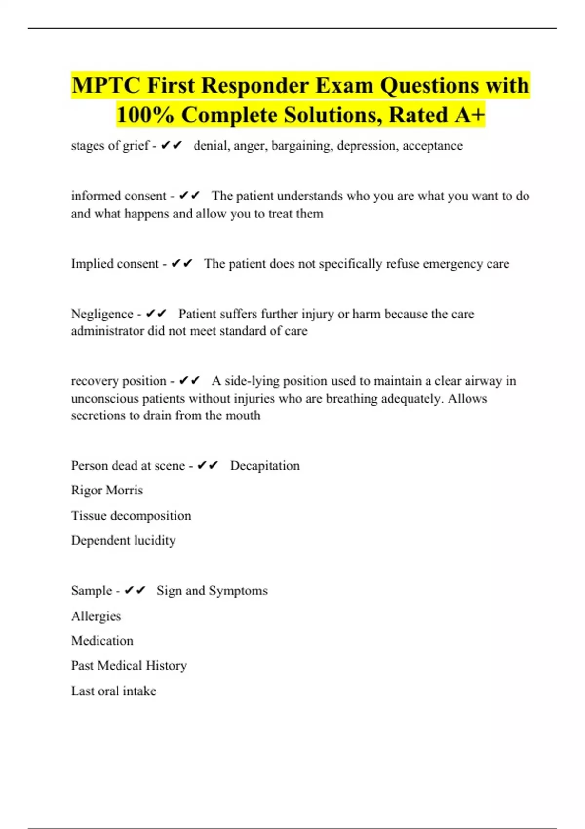 MPTC First Responder Exam Questions with 100% Complete Solutions, Rated A+