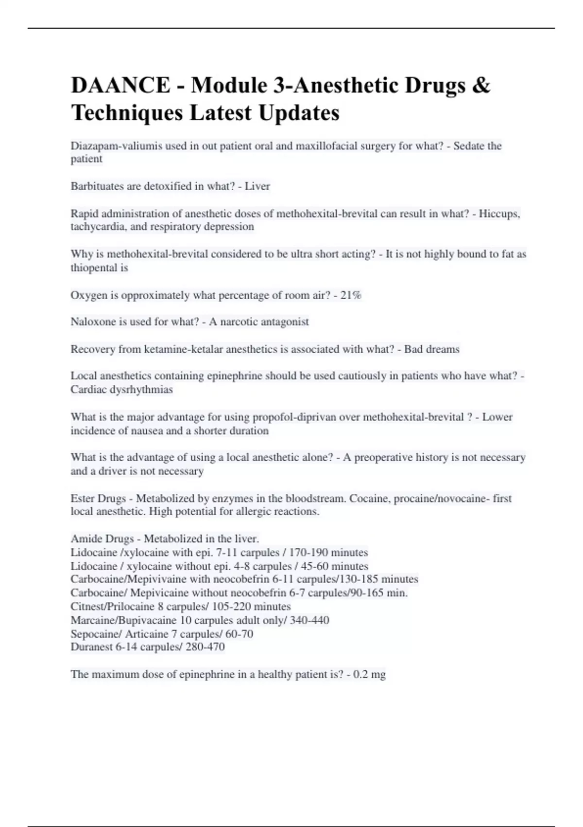 DAANCE - Module 3-Anesthetic Drugs & Techniques Latest Updates Diazapam-valiumis used in out patient oral and maxillofacial surgery for what? - Sedate the patient Barbituates are detoxified in what? - Liver Rapid administration of anesthetic doses of methohexital-brevital can result in what? - Hiccups, tachycardia, and respiratory depression Why is methohexital-brevital considered to be ultra short acting? - It is not highly bound to fat as thiopental is Oxygen is opproximately what percentage of room air? - 21% Naloxone is used for what? - A narcotic antagonist Recovery from ketamine-ketalar anesthetics is associated with what? - Bad dreams Local anesthetics containing epinephrine should be used cautiously in patients who have what? - Cardiac dysrhythmias What is the major advantage for using propofol-diprivan over methohexital-brevital ? - Lower incidence of nausea and a shorter duration What is the advantage of using a local anesthetic alone? - A preoperative history is not necessary and a driver is not necessary Ester Drugs - Metabolized by enzymes in the bloodstream. Cocaine, procaine/novocaine- first local anesthetic. High potential for allergic reactions. Amide Drugs - Metabolized in the liver. Lidocaine /xylocaine with epi. 7-11 carpules / 170-190 minutes Lidocaine / xylocaine without epi. 4-8 carpules / 45-60 minutes Carbocaine/Mepivivaine with neocobefrin 6-11 carpules/130-185 minutes Carbocaine/ Mepivicaine without neocobefrin 6-7 carpules/90-165 min. Citnest/Prilocaine 8 carpules/ 105-220 minutes Marcaine/Bupivacaine 10 carpules adult only/ 340-440 Sepocaine/ Articaine 7 carpules/ 60-70 Duranest 6-14 carpules/ 280-470 The maximum dose of epinephrine in a healthy patient is? - 0.2 mg The maximum dose of epinephrine in a patient with cardiovascular disease? - .04 mg Basic requirements of an anesthetic - Lack of toxicity Non-flammable Preferably non-addictive Minimal allergenicity The components of balanced anesthesia (4) - Analgesia Amnesia Relaxation Loss of consciousness (hypnosis) Hypnosis - Feeling of being asleep. Agents which are most effective in providing loss of consciousness and hypnosis are proposal and barbiturates such as methohexital (brevital.) Relaxation and immobility - SX is often performed adjacent to important anatomical structures such as nerves of the face and neck so it is essential that the pt. Be relaxed and immobile during the procedure. Benzodiazepines used: versed, propofol, brevital, ketamine. Amnesia - Failure to remember events related to surgery. The agents that provide the most effective amnesia are benzodiazepines like versed (midazolam) and valum (diazepam) Analgesia - inability to feel pain Drugs used to achieve: ketamine, fentanyl. Additional desirable attributes of an anesthetic - Maintenance of the body's homeostatic mechanisms. (BP, HR.) Rapid, smooth comfortable induction Freedom of post operative nausea and vomiting Retention of sufficient pharyngeal and laryngeal reflexes to prevent aspiration but predispose pt to laryngospasm. Post of euphoria Rapid recovery and readiness for discharge Easily adapted and used for children and seniors Capable of easy administration with familiar equipment and supplies A technique well documented in the anesthesia literature and consistent with techniques currently used by anesthesiologists Cost effective 5 primary areas within the CNS where anesthetics work - 1. The centers of emotion 2. The centers of wakefulness
