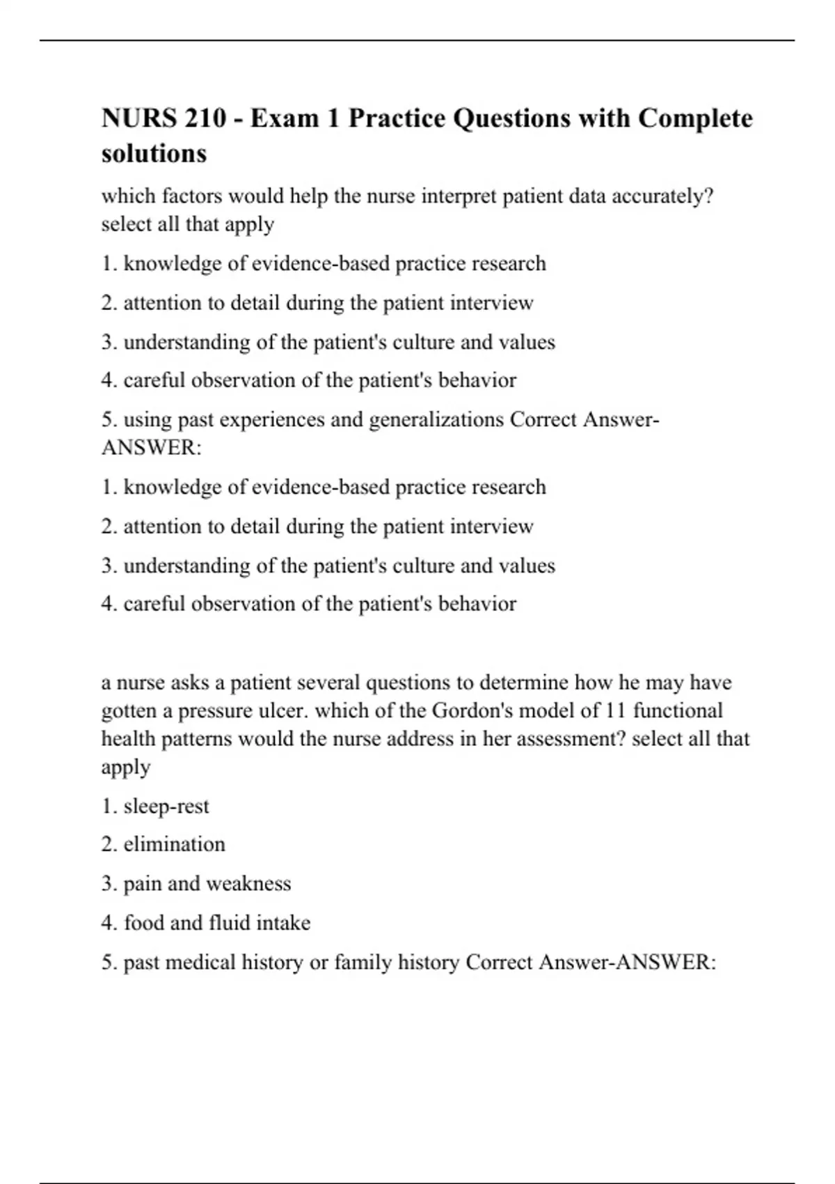 NURS 210 - Exam 1 Practice Questions with Complete solutions