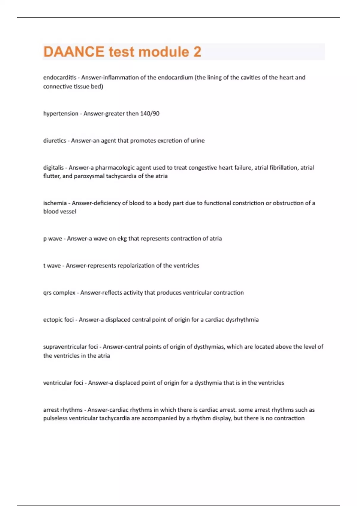 endocarditis - Answer-inflammation of the endocardium (the lining of the cavities of the heart and connective tissue bed) hypertension - Answer-greater then 140/90 diuretics - Answer-an agent that promotes excretion of urine digitalis - Answer-a pharmacologic agent used to treat congestive heart failure, atrial fibrillation, atrial flutter, and paroxysmal tachycardia of the atria ischemia - Answer-deficiency of blood to a body part due to functional constriction or obstruction of a blood vessel p wave - Answer-a wave on ekg that represents contraction of atria t wave - Answer-represents repolarization of the ventricles qrs complex - Answer-reflects activity that produces ventricular contraction ectopic foci - Answer-a displaced central point of origin for a cardiac dysrhythmia supraventricular foci - Answer-central points of origin of dysthymias, which are located above the level of the ventricles in the atria ventricular foci - Answer-a displaced point of origin for a dysthymia that is in the ventricles arrest rhythms - Answer-cardiac rhythms in which there is cardiac arrest. some arrest rhythms such as pulseless ventricular tachycardia are accompanied by a rhythm display, but there is no contractioncompensatory pause - Answer-a long beat that compensates for a shorter beat which contains either an atrial or ventricular premature contraction supraventricular tachycardia - Answer-rate of 150-250 BMP, narrow QRS complex paroxysmal supraventricular tachycardia - Answer-sudden attacks of rapid heartbeats atrial fibrillation - Answer-irregular and rapid ventricular rate atrial flutter - Answer-atrial contractions are regular but rapid, 200-320 BPM junctional rhythms - Answer-cardiac dysrhythmia in which the ectopic pacemaker is in the area of the AV junction premature ventricular contractions (PVC) - Answer-premature contraction of the heart that is independent of the normal rhythm and arises in response to an impulse in the ventricle multifocal premature ventricular contractions (PVCS) - Answer-PVCs for which there are two or more ectopic foci that generate PVCs of different configurations run of couplets - Answer-3 or more pvcs ventricular tachycardia - Answer-140-200 bpm, wide QRS complex with no p waves ventricular fibrillation - Answer-contractions of ventricle muscle fibers due to rapid excitation of myocardial fibers without coordinated contraction of the ventricle asystole - Answer-flatlinepulseless electrical activity - Answer-when a normal rhythm appears on ekg screen although there is no contraction of the heart 3 R to identifying abnormal ekg - Answer-rhythm, rate, regularity AV block - Answer-a microscopic collection of heart muscle fibers involved in the electrical activity of the heart emphysema - Answer-enlargement of the alveolar sac in the lungs, trouble getting oxygen dyspnea - Answer-breathlessness or difficulty in breathing, usually associated with heavy cigarette smoking corticosteroids - Answer-steroids produced by the adrenal cortex and involved in in body's response to stress and anti-inflammatory purposes glucocortcoids - Answer-hormone that responds to stress bronchitis - Answer-temporary inflammation of bronchial tubes