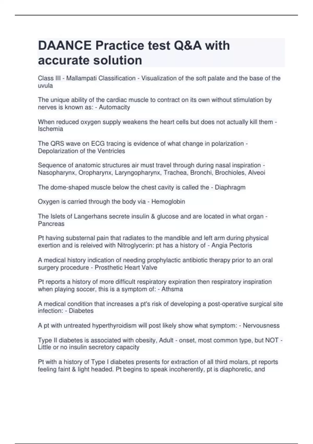 DAANCE Practice test Q&A with accurate solution Class III - Mallampati Classification - Visualization of the soft palate and the base of the uvula The unique ability of the cardiac muscle to contract on its own without stimulation by nerves is known as: - Automacity When reduced oxygen supply weakens the heart cells but does not actually kill them - Ischemia The QRS wave on ECG tracing is evidence of what change in polarization - Depolarization of the Ventricles Sequence of anatomic structures air must travel through during nasal inspiration - Nasopharynx, Oropharynx, Laryngopharynx, Trachea, Bronchi, Brochioles, Alveoi The dome-shaped muscle below the chest cavity is called the - Diaphragm Oxygen is carried through the body via - Hemoglobin The Islets of Langerhans secrete insulin & glucose and are located in what organ - Pancreas Pt having substernal pain that radiates to the mandible and left arm during physical exertion and is releived with Nitroglycerin: pt has a history of - Angia Pectoris A medical history indication of needing prophylactic antibiotic therapy prior to an oral surgery procedure - Prosthetic Heart Valve Pt reports a history of more difficult respiratory expiration then respiratory inspiration when playing soccer, this is a symptom of: - Athsma A medical condition that increases a pt's risk of developing a post-operative surgical site infection: - Diabetes A pt with untreated hyperthyroidism will post likely show what symptom: - Nervousness Type II diabetes is associated with obesity, Adult - onset, most common type, but NOT - Little or no insulin secretory capacity Pt with a history of Type I diabetes presents for extraction of all third molars, pt reports feeling faint & light headed. Pt begins to speak incoherently, pt is diaphoretic, and becmes agitated. The mother forgot the pt's morning dose of insulin, the pt is experiencing: - Hypoglycemia Impulses are conducted from one neuron to another. This junction between these two neurons is called: - Synapse The fifth cranial nerve that supplies sensation to the teeth and mandible: - Trigeminal Nerve The portion of the nervous system that controls the viscera (internal) organs or unconscious functions of the body is known as: - Autonomic Nervous System (ANS)