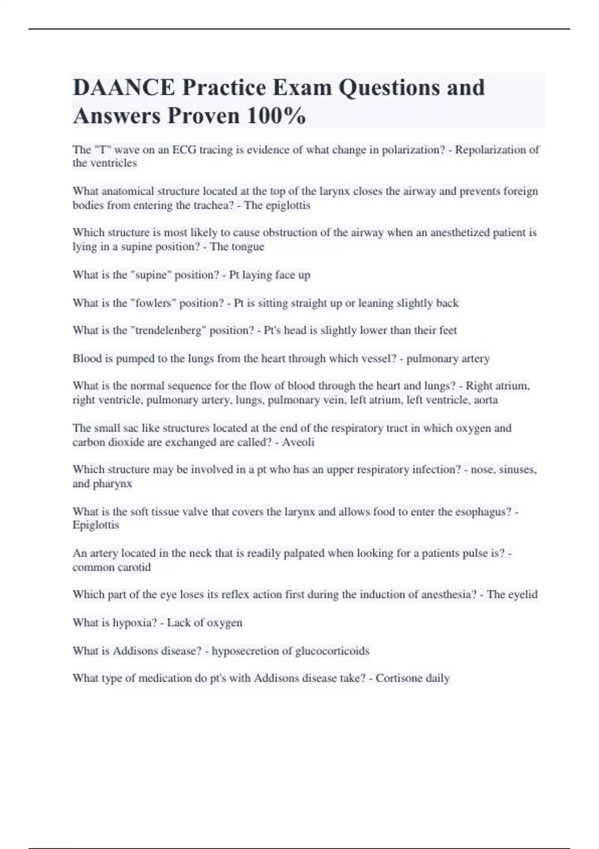 DAANCE Practice Exam Questions and Answers Proven 100% The "T" wave on an ECG tracing is evidence of what change in polarization? - Repolarization of the ventricles What anatomical structure located at the top of the larynx closes the airway and prevents foreign bodies from entering the trachea? - The epiglottis Which structure is most likely to cause obstruction of the airway when an anesthetized patient is lying in a supine position? - The tongue What is the "supine" position? - Pt laying face up What is the "fowlers" position? - Pt is sitting straight up or leaning slightly back What is the "trendelenberg" position? - Pt's head is slightly lower than their feet Blood is pumped to the lungs from the heart through which vessel? - pulmonary artery What is the normal sequence for the flow of blood through the heart and lungs? - Right atrium, right ventricle, pulmonary artery, lungs, pulmonary vein, left atrium, left ventricle, aorta The small sac like structures located at the end of the respiratory tract in which oxygen and carbon dioxide are exchanged are called? - Aveoli Which structure may be involved in a pt who has an upper respiratory infection? - nose, sinuses, and pharynx What is the soft tissue valve that covers the larynx and allows food to enter the esophagus? - Epiglottis An artery located in the neck that is readily palpated when looking for a patients pulse is? - common carotid Which part of the eye loses its reflex action first during the induction of anesthesia? - The eyelid What is hypoxia? - Lack of oxygen What is Addisons disease? - hyposecretion of glucocorticoids What type of medication do pt's with Addisons disease take? - Cortisone daily What is hyperglycemia? - An insufficient supply of insulin which is produced in the pancreas, prevents the body's cells from metabolizing carbohydrates properly. What is "Type 1 diabetes"? - Insulin dependent What is "type 2 diabetes?" - non-insulin diabetes A pt with history of transient ischemic attacks (TIA's) has had temporary lessening of? - Blood supply to the brain Ischemic heart disease is a result of? - decreased blood flow in the coronary arteries The main purpose of the review of systems is to obtain a careful evaluation of the pt's? - Medical history A pt who has renal disease would be expected to have difficulty with? - drug excretion Medical history is not used to document ? - The socioeconomic status of the pt. Congestive failure does not result in? - bronchospasm Normal blood oxygen saturation in an ASA class I pt ranges from? - 95%-100% Why are diabetic pt's at risk for oral and maxillofacial surgery? - Pt's are subject to postoperative infections. A pt who has had a myocardial infarction should wait how many months before having elective surgery? - 6 months What is midazolam? - Versed What is glycopyrrolate? - Robinul What does robinul do? - Dry mouth What type of drug is "diazepam"? - Anxiolytics (dissolving anxiety) What is another word for "diazepam"? - Valium What is another word for "midazolam"? - Versed What is the main difference between valium and versed? - Versed is faster acting and water soluble, making it less irritating to the veins. What is a narcotic? - Used to provide systemic pain control What is fentanyl (Sublimaze) - A narcotic, Much more potent than demerol or morphine What is diphenhydramine? - Benadryl What is another word for "Dexamethasone"? - Decadron What type of medication is decadron? - A steroid What is another name for "Odanestron?" - Zofran What does "odanestron" do? - Helps with perioperative nausea What does decardon help with? - The prevention of swelling