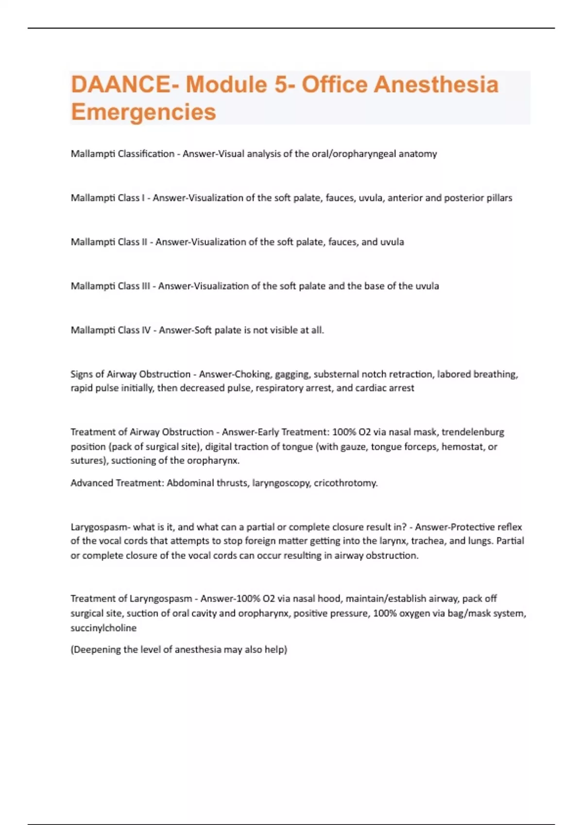 Mallampti Classification - Answer-Visual analysis of the oral/oropharyngeal anatomy Mallampti Class I - Answer-Visualization of the soft palate, fauces, uvula, anterior and posterior pillars Mallampti Class II - Answer-Visualization of the soft palate, fauces, and uvula Mallampti Class III - Answer-Visualization of the soft palate and the base of the uvula Mallampti Class IV - Answer-Soft palate is not visible at all. Signs of Airway Obstruction - Answer-Choking, gagging, substernal notch retraction, labored breathing, rapid pulse initially, then decreased pulse, respiratory arrest, and cardiac arrest Treatment of Airway Obstruction - Answer-Early Treatment: 100% O2 via nasal mask, trendelenburg position (pack of surgical site), digital traction of tongue (with gauze, tongue forceps, hemostat, or sutures), suctioning of the oropharynx. Advanced Treatment: Abdominal thrusts, laryngoscopy, cricothrotomy. Larygospasm- what is it, and what can a partial or complete closure result in? - Answer-Protective reflex of the vocal cords that attempts to stop foreign matter getting into the larynx, trachea, and lungs. Partial or complete closure of the vocal cords can occur resulting in airway obstruction. Treatment of Laryngospasm - Answer-100% O2 via nasal hood, maintain/establish airway, pack off surgical site, suction of oral cavity and oropharynx, positive pressure, 100% oxygen via bag/mask system, succinylcholine (Deepening the level of anesthesia may also help)Bronchospasm - Answer-Generalized contraction of the smooth muscles of the small bronchi and bronchioles of the lungs, resulting in restriction of airflow to and from the lungs. Patient will have more difficulty with expiration than inspiration. Patients more susceptible to bronchospasm - Answer-Patients with history of allergies, asthma, COPD, and bronchitis Diagnosis of Bronchospasm - Answer-Labored breathing, aspirational difficulty, signs of diminishing respiratory status (cyanosis or decreased ventilation patterns on capnograph) Treatment of Bronchospasm - Answer-100% Oxygen via bag/mask, albuterol, atrovent, epinephrine injection, intubation/ventilation, steroid injection, diphenhydramine, aminophylline. (Activate EMS after steroid injection if it has not been resolved) Aspiration - Answer-Occurs when the contents of the stomach enter the lungs secondary to emesis, or when a foreign body or fluid inadvertently enters the lungs from the oral pharyngeal cavity through the larynx. Treatment of Emesis with Aspiration - Answer-Activate EMS, 100% O2 via bag/mask, turn patient on right side with head down (trendelenburg position), tonsil suction, removal of visible foreign bodies, intubation, transport to acute care facility Hyperventilation - Answer-Occurs when the patient is breathing at a rate faster than his/her normal breathing pattern or breathing more deeply than the body requires. Triggered by a change in body's natural balance of oxygen and carbon dioxide. Patient exhales too much carbon dioxide and will begin to feel light headed. Treatment of Hyperventilation - Answer-Early: terminate treatment and remove foreign bodies from mouth and remove surgical instruments from view, maintain airway, verbally try to calm the patient, monitor vitals, DO NOT GIVE OXYGEN, have patient breathe into a bag to recapture exhaled CO2 Advanced: If patient is not sedated try IV midazolam, diazepam, propofol, etc., continue to monitor vitals, discontinue breathing bag as breathing returns to normal, activate EMS if condition deterioratesRespiratory Depression and Apnea - Answer-Can be the result of many different causes and can result in increased heart rate and the development of hypoxia and cyanosis. Many of the drugs administered for sedation can depress or stop the patient's ability to breathe Acute Coronary Syndrome - Answer-Two components: 1. Angina: damage to myocardium from dimished blood flow through coronary arteries. 2. Myocardial infarction: death of myocardial tissue when coronary arteries become occlueded. Treatment of Angina Attack- what are the steps, and what can we assume after a certain amount of treatment? - Answer-Stop surgery, give Nitroglycerine and 100% oxygen, make patient comfortable. If 3 doses of nitroglycerin does not provide relief, it should be assumed the patient is having a myocardial infarction Treatment of Miocardial infarction - Answer-Stop surgery, remove foreign bodies from mouth, place in comfy position, oxygen, activate EMS when surgeon tells you too Treatment of Acute Coronary Syndrome - Answer-Activate EMS and closely observe vitals, 100% O2 via mask, make patient comfy/reassure, attach AED defibrillator, Aspirin 325 mg, establish IV access with normal saline slow drip, morphine for pain MONA - Answer-Morphine (helps with pain, decreases BP, and workload of heart) Oxygen (heart needs oxygen) Nitroglycerin (dilates blood vessels) Aspirin (thins blood) Treatment of Symptomatic Bradycardia - Answer-Terminate the procedure, 100% O2, establish IV, Atropine, May need to be transported to the ER for transcutaneous pacing Treatment of Supraventricular Tachycardia - Answer-Place patient in supine position, give adenosine, rapidly flush after with saline, repeat up to three times. Treatment of Premature Ventricular Contractions (PVCs) - Answer-Try to determine cause and correct, lidocaine .5-1.5mg, repeat every 5 to 10 minutes up to 3mgTreatment of Ventricular Tachycardia - Answer-If unstable treat as V. Fib. If stable: 100% O2, Amiodarone 150mg over 10 minutes, prepare for synchronous cardioversion Treatment of Ventricular Fibrillation - Answer-Activate EMS immediately, CPR/mechanical defibrillation Continue CPR, establish IV and give epi 1mg, CPR/repeat shock as above, may give a single dose of vasopressin to replace 1 and 2 doses of epi. Amiodarone, lidocaine and magnesium may be considered as well. Continue CPR and recheck rhythm after 5 cycles Treatment of Asystole - Answer-Administer CPR, epinephrine 1mg. IV. May