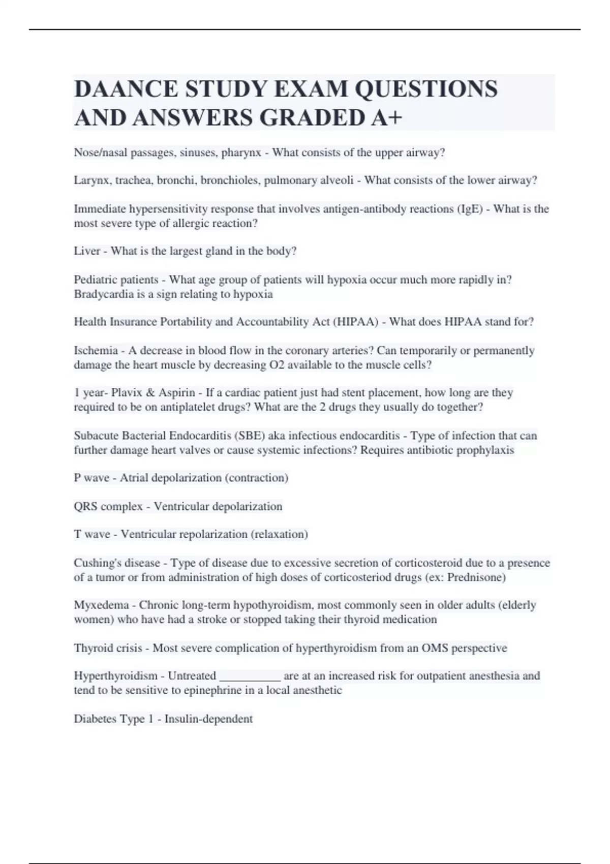 DAANCE STUDY EXAM QUESTIONS AND ANSWERS GRADED A+ Nose/nasal passages, sinuses, pharynx - What consists of the upper airway? Larynx, trachea, bronchi, bronchioles, pulmonary alveoli - What consists of the lower airway? Immediate hypersensitivity response that involves antigen-antibody reactions (IgE) - What is the most severe type of allergic reaction? Liver - What is the largest gland in the body? Pediatric patients - What age group of patients will hypoxia occur much more rapidly in? Bradycardia is a sign relating to hypoxia Health Insurance Portability and Accountability Act (HIPAA) - What does HIPAA stand for? Ischemia - A decrease in blood flow in the coronary arteries? Can temporarily or permanently damage the heart muscle by decreasing O2 available to the muscle cells? 1 year- Plavix & Aspirin - If a cardiac patient just had stent placement, how long are they required to be on antiplatelet drugs? What are the 2 drugs they usually do together? Subacute Bacterial Endocarditis (SBE) aka infectious endocarditis - Type of infection that can further damage heart valves or cause systemic infections? Requires antibiotic prophylaxis P wave - Atrial depolarization (contraction) QRS complex - Ventricular depolarization T wave - Ventricular repolarization (relaxation) Cushing's disease - Type of disease due to excessive secretion of corticosteroid due to a presence of a tumor or from administration of high doses of corticosteriod drugs (ex: Prednisone) Myxedema - Chronic long-term hypothyroidism, most commonly seen in older adults (elderly women) who have had a stroke or stopped taking their thyroid medication Thyroid crisis - Most severe complication of hyperthyroidism from an OMS perspective Hyperthyroidism - Untreated __________ are at an increased risk for outpatient anesthesia and tend to be sensitive to epinephrine in a local anesthetic Diabetes Type 1 - Insulin-dependent Diabetes Type 2 - Non-insulin dependent Elevated LFTs (Liver function tests) - Elevated level of several liver enzymes and bilirubin is often termed? Women - What gender is Propofol more rapidly redistributed in and require 10-15% larger dose? Children - What age group would Propofol redistribute very rapidly, and require at least 50% increase in drug dose? Diffusion hypoxia - What is a complication of N2O rapidly moving from blood to alveoli of lungs, and displaces other gases, including O2 General anesthesia - Patient is not aroused, even during painful stimulation. Required airway intervention & cardiovascular function is impaired Deep sedation/analgesia - Can't be easily aroused, purposeful response to pain, and requires airway assistance Moderate sedation (conscious sedation) - Response to verbal or light tactile touch with no compromise of airway Minimal sedation (anxiolysis) - Normal response to verbal stimulation with airway reflexes, ventiliation & cardiovascular functions are unaffected Valium or Versed - What drugs are given for minimal sedation (anxiolysis) Balanced anesthesia - Anesthesia that relies on the use of several agents together to benefit from each other. Using each drug at a smaller dose than required if it were being used alone 0.2 mg - Maximum does of Epi for a healthy patient? 100% O2, Dantrolene (2.5 mg/kg) and IV cold saline (NOT Ringer's) - What is the treatment for Malignant Hyperthermia? Hypertension - What emergency would a beta blocker be given? 0.04 mg - What is the maximum dose of Epi for a patient with cardiovascular disease? Asystole - Cardiac arrest- has no rhythm or contraction of EKG Ventricular fibrillation (V-fib) - No discernable P, QRS or T waves noted. No pumping of blood at all and no depolarization of the ventricles V-Fib or Asytole - What are 2 emergencies would Epi be given in? Lidocaine - What are PVCs treated with? Versed, valium or propofol - What medications can be given for a severe case of hyperventilation? Ventricular tachycardia (V-tach) - Dysrhythmia with a rapid firing of an ectopic focus with a rate of 140-200 BPM but no P wave Amiodarone - What medication would be given for V-tach? Adenosine, Inderal or Esmolol - What are 3 different medications that could be given for SVT? Atropine - What medication would be given for symptomatic bradycardia? Airway obstruction - What emergency would a cricothyrotomy typically be performed? ETT, LMA or ETA (endotracheal tube, laryngeal mask airway, esophageal tracheal airway) - What type of intubation is preferred with emesis and aspiration? Medical information that helps oral surgeons identify poor-risk patients, guide treatment, and written evidence the patient was given to evaluate the treatment plan - What are the 3 basic requirements to follow when gathering medical information? Hematuria - What is the term for blood in the urine? Pulmonary artery - What is the artery that carries oxygen-poor (venous) blood from the heart to the lungs? Right atrium, right ventricle, pulmonary artery, lungs, pulmonary veins, left atrium, left ventricle, aorta - What is the blood flow through the heart? 100% O2, turn patient to their right side with head down, tonsil suction, intubate - What is the treatment for emesis with aspiration? Laryngospasm - Crowing sounds, labored breathing, suprasternal retraction & rocking of the chest and abdomen (paradoxical) are signs of what? 100% O2, head tilt chin position, tonsil suction, bag/mask, succinylcholine - Treatment of a laryngospasm Tracheostomy - Surgical airway below level of larynx into the trachea is called what? Capnograph/capnometer - Device that monitors ventilation in real time by measuring the level of O2 the patient exhales Pulse oximeter - Device that monitors ventilation and circulation Bronchspasm - Difficulty with expiration not inspiration, wheezing and labored breathing are signs of what medical emergency? 100% O2, Albuterol inhaler, epi, ETT/LMA or Igel, and a steroid - Treatment of bronchospasm MP 1 - What MP classification is visualization of soft palate, fauces, uvula, an