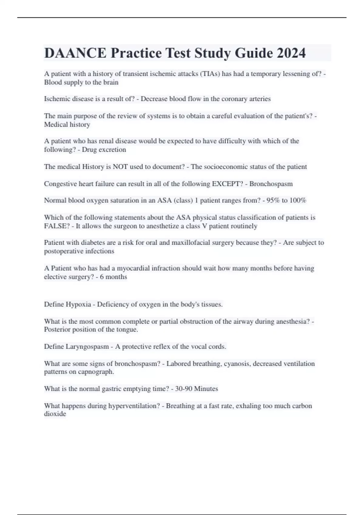 DAANCE Practice Test Study Guide 2024 A patient with a history of transient ischemic attacks (TIAs) has had a temporary lessening of? - Blood supply to the brain Ischemic disease is a result of? - Decrease blood flow in the coronary arteries The main purpose of the review of systems is to obtain a careful evaluation of the patient's? - Medical history A patient who has renal disease would be expected to have difficulty with which of the following? - Drug excretion The medical History is NOT used to document? - The socioeconomic status of the patient Congestive heart failure can result in all of the following EXCEPT? - Bronchospasm Normal blood oxygen saturation in an ASA (class) 1 patient ranges from? - 95% to 100% Which of the following statements about the ASA physical status classification of patients is FALSE? - It allows the surgeon to anesthetize a class V patient routinely Patient with diabetes are a risk for oral and maxillofacial surgery because they? - Are subject to postoperative infections A Patient who has had a myocardial infraction should wait how many months before having elective surgery? - 6 months Define Hypoxia - Deficiency of oxygen in the body's tissues. What is the most common complete or partial obstruction of the airway during anesthesia? - Posterior position of the tongue. Define Laryngospasm - A protective reflex of the vocal cords. What are some signs of bronchospasm? - Labored breathing, cyanosis, decreased ventilation patterns on capnograph. What is the normal gastric emptying time? - 30-90 Minutes