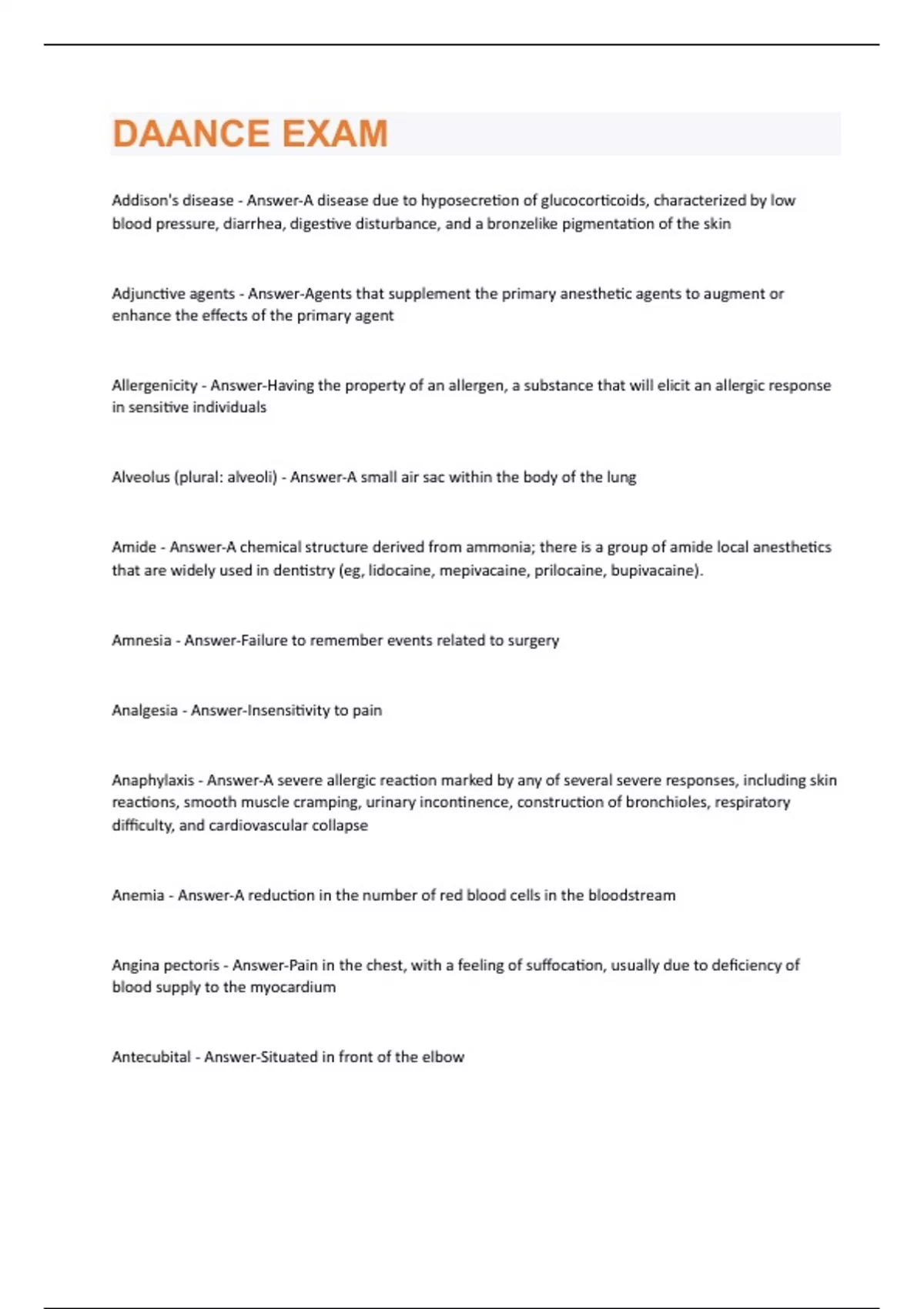 DAANCE EXAM Addison's disease - Answer-A disease due to hyposecretion of glucocorticoids, characterized by low blood pressure, diarrhea, digestive disturbance, and a bronzelike pigmentation of the skin Adjunctive agents - Answer-Agents that supplement the primary anesthetic agents to augment or enhance the effects of the primary agent Allergenicity - Answer-Having the property of an allergen, a substance that will elicit an allergic response in sensitive individuals Alveolus (plural: alveoli) - Answer-A small air sac within the body of the lung Amide - Answer-A chemical structure derived from ammonia; there is a group of amide local anesthetics that are widely used in dentistry (eg, lidocaine, mepivacaine, prilocaine, bupivacaine). Amnesia - Answer-Failure to remember events related to surgery Analgesia - Answer-Insensitivity to pain Anaphylaxis - Answer-A severe allergic reaction marked by any of several severe responses, including skin reactions, smooth muscle cramping, urinary incontinence, construction of bronchioles, respiratory difficulty, and cardiovascular collapse Anemia - Answer-A reduction in the number of red blood cells in the bloodstream Angina pectoris - Answer-Pain in the chest, with a feeling of suffocation, usually due to deficiency of blood supply to the myocardium Antecubital - Answer-Situated in front of the elbowAntecubital fossa - Answer-The depression between the forearm and the upper arm that is literally "in front of the elbow" Anticholinergic - Answer-A drug that counteracts the action of acetylcholine, the neurotransmitter of the parasympathetic nervous system and thereby blocks the action of the parasympathetic nerves Antiemetic - Answer-A drug that counteracts nausea and vomiting Antisialagogue - Answer-A drug that counteracts the production of saliva Anxiolytic - Answer-Drugs that reduce anxiety, agitation, or tension (eg, Valium, midazolam) Aorta - Answer-The main trunk (a very large artery) from which the arterial system proceeds Apnea - Answer-Absence or cessation of breathing Arrest rhythms - Answer-Cardiac rhythms in which there is cardiac arrest. Some arrest rhythms such as pulseless ventricular tachycardia are accompanied by a rhythm display, but there is no contraction Arrhythmia - Answer-Any variation from the normal rhythm of the heartbeat Arteriole - Answer-Any of the very small arterial branches located at the end of an artery (furthest from the heart) Artery - Answer-A vessel that varies blood away from the heart to other parts of the body Ascites - Answer-Accumulation of the serous fluid in the abdominal cavity Asystole - Answer-Cardiac arrest in which there is no rhythm display and no contractionAtaractics - Answer-Pharmacologic agents that produce a tranquilizing effect Atherosclerosis - Answer-A disease of the arteries characterized by the deposition of plaques of fatty material on their inner walls Atrial fibrillation - Answer-Atrial arrhythmia characterized by rapid randomized contractions of the atrial myocardium, causing a totally irregular and often rapid ventricular rate Atrial flutter - Answer-A condition of cardiac arrhythmia in which the atrial contractions are rapid (200 to 320 per minute) Atrial (supraventricular) rhythms - Answer-Dysrythmias in which the pacemaker is in the atria above the level of the ventricles (supraventricular) area Atrial Tachycardia - Answer-Rapid heartbeat originating from the atria Atrioventricular block (AV block) - Answer-A cardiac conduction defect in which the impulse generated by the SA node is partially or completely blocked in the area of the AV nose Atrioventricular node - Answer-A microscopic collection of heart muscle fibers involved in the electrical activity of the heart Atrium (plural: atria) - Answer-An upper chamber of the heart; atria also exist in other parts of the body Automaticity - Answer-The condition of being automatic Autonomic nervous system - Answer-A portion of the nervous system concerned with regulation of the activity of cardiac muscle, smooth muscle, and glands Balanced anesthesia - Answer-Anesthesia that relies on the use of several agents together, capitalizing on the best aspects of each agent, but using each at a smaller dose than would be required if it were used aloneBarbiturates - Answer-A group of pharmacologic agents that have sedative properties and produce amnesia and a hypnotic effect (eg, thiopental sodium, brevital) Baroreceptor - Answer-A sensory nerve ending that is stimulated by changes in pressure, as those in the walls of blood vessels Blood Dyscrasia - Answer-Any abnormal condition of the blood Bolus - Answer-A rapidly administered dose of medication, as compared to a slow, steady administration of medication with continuous infusion Brachial artery - Answer-Artery that supplies blood to the shoulder, arm, forearm, and hand Brachiocephalic artery - Answer-The large artery on the right of the neck that distributes blood to the right side of the head and neck and right arm Bradycardia - Answer-Slow heart rate (less than 60 beats per minute) Bronchiole - Answer-One of the finer (1mm or less) subdivisions of the branched bronchial tree Bronchus - Answer-Any of the larger air passages of the lungs Bundle of His (HISS) - Answer-A small band of atypical cardiac muscle fibers the propagates the atrial contradiction rhythm to the ventricles Capillary - Answer-Any of the minute vessels that connect the arterioles and venules, forming a network in nearly all parts of the body Capnography - Answer-Measurement and recording of the amount of carbon dioxide in expires airCardiac dysrhythmias (arrhythmias) - Answer-Rhythm disturbances of the heart Cardiac cycle - Answer-The complete cardiac movement (the systolic and diastolic movement with the interval between them) or heartbeat; the number of cardiac cycles per minute constitutes the heart rate Cardiac output - Answer-The total amount of blood pumped by either ventricle of the heart per unit of time (usually volume pe