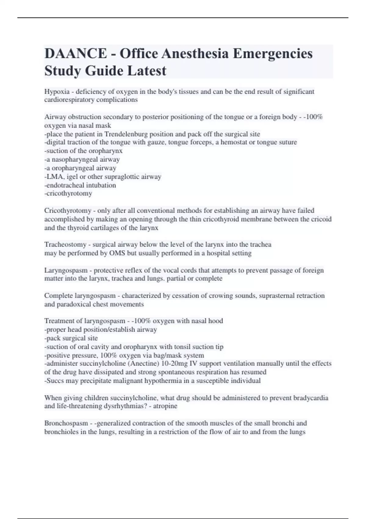 DAANCE - Office Anesthesia Emergencies Study Guide Latest Hypoxia - deficiency of oxygen in the body's tissues and can be the end result of significant cardiorespiratory complications Airway obstruction secondary to posterior positioning of the tongue or a foreign body - -100% oxygen via nasal mask -place the patient in Trendelenburg position and pack off the surgical site -digital traction of the tongue with gauze, tongue forceps, a hemostat or tongue suture -suction of the oropharynx -a nasopharyngeal airway -a oropharyngeal airway -LMA, igel or other supraglottic airway -endotracheal intubation -cricothyrotomy Cricothyrotomy - only after all conventional methods for establishing an airway have failed accomplished by making an opening through the thin cricothyroid membrane between the cricoid and the thyroid cartilages of the larynx Tracheostomy - surgical airway below the level of the larynx into the trachea may be performed by OMS but usually performed in a hospital setting Laryngospasm - protective reflex of the vocal cords that attempts to prevent passage of foreign matter into the larynx, trachea and lungs. partial or complete Complete laryngospasm - characterized by cessation of crowing sounds, suprasternal retraction and paradoxical chest movements Treatment of laryngospasm - -100% oxygen with nasal hood -proper head position/establish airway -pack surgical site -suction of oral cavity and oropharynx with tonsil suction tip -positive pressure, 100% oxygen via bag/mask system -administer succinylcholine (Anectine) 10-20mg IV support ventilation manually until the effects of the drug have dissipated and strong spontaneous respiration has resumed -Succs may precipitate malignant hypothermia in a susceptible individual When giving children succinylcholine, what drug should be administered to prevent bradycardia and life-threatening dysrhythmias? - atropine Bronchospasm - -generalized contraction of the smooth muscles of the small bronchi and bronchioles in the lungs, resulting in a restriction of the flow of air to and from the lungs -more difficulty with expiration than inspiration Treatment of bronchospasm - -100% oxygen via bag/mask - albuterol inhalation (Beta-2 agonist) 4-8 puffs via inhaler every 20 minutes for up to 4 hours, then every 1-4 hours as needed -Ipratropium bromide (Atrovent) 2 puffs stat; repeat every 4 hours -Epinephrine injection (alpha and beta agonist) - Intubation/ventilation (endotracheal tube, LMA, igel or combitube) -Steroid injection such as dexmesthasone 4-6mg IV or hydrocortisone 100mg IV -Diphenhydramine 50mg IV -Aminophylline is no loner considered a first-time drug for management of bronchospasm -EMS Emesis with aspiration - occurs when the contents of the stomach enter the lungs secondary to emesis (vomiting or passive regurgitation) According to ASA, solid foods should not be eaten for how many hours prior to surgery? and clear liquids? - six ; two Treatment of aspiration - -activate EMS, protect the IV catheter -100% oxygen via bag/mask -turn patient on his/her right side with head down -tonsil suction of oral cavity/oropharynx -removal of visible foreign bodies with a laryngoscope and Magill forceps -Intubation (ETT-preferred, LMA, igel, or combitube) with suction via suction catheter -transport to an acute care facility Hyperventilation - occurs when the patient is breathing at a faster rate than normal, or breathing more deeply than the body requires; exhaling too much carbon dioxide Treatment of hyperventilation - *early* -terminate treatment and remove foreign bodies from mouth and remove surgical instruments from view -maintain the airway -verbally try to calm the patient -monitor vital signs -do NOT give oxygen -have patient breathe into a bag to recapture exhaled CO2