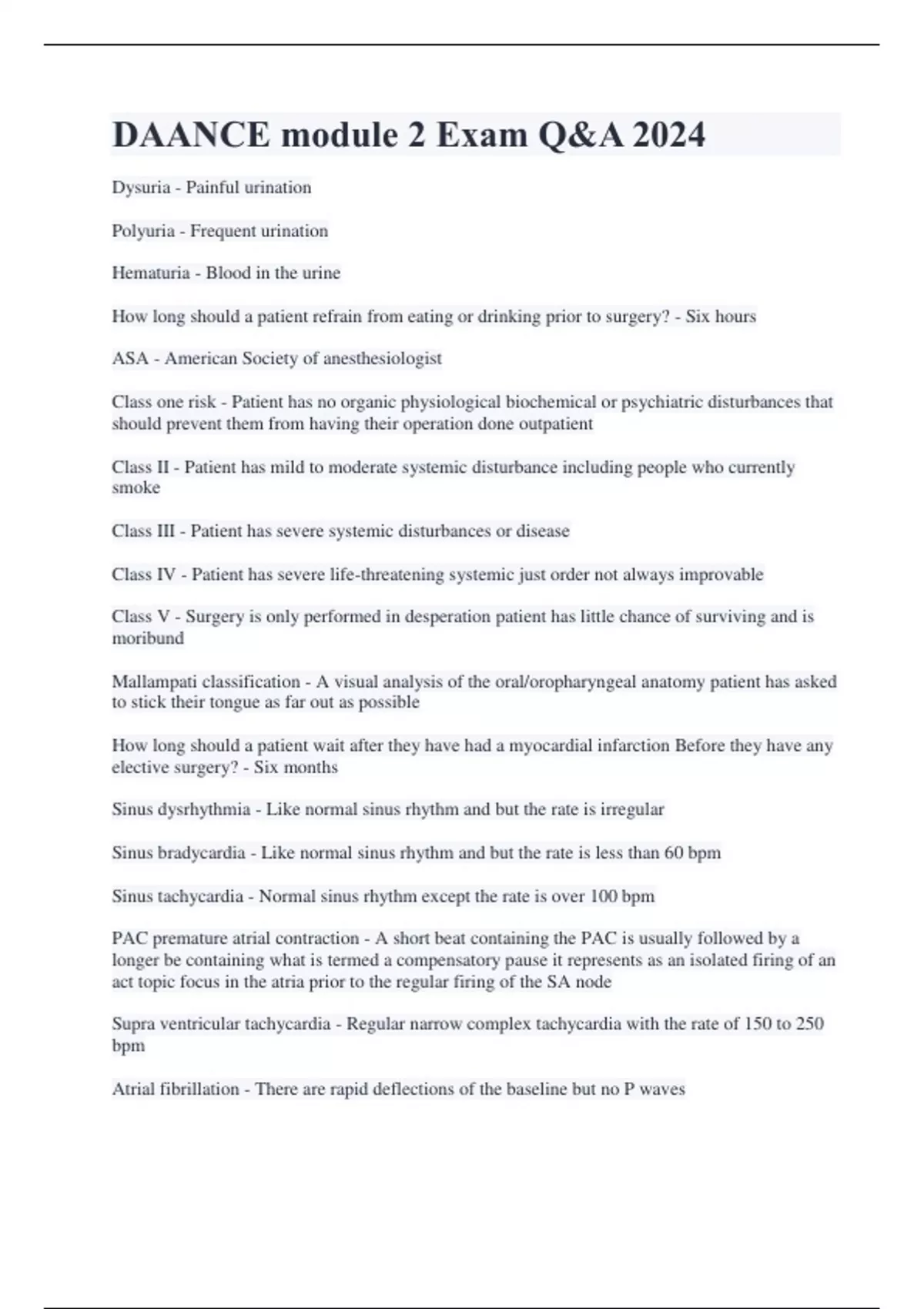 DAANCE module 2 Exam Q&A 2024 Dysuria - Painful urination Polyuria - Frequent urination Hematuria - Blood in the urine How long should a patient refrain from eating or drinking prior to surgery? - Six hours ASA - American Society of anesthesiologist Class one risk - Patient has no organic physiological biochemical or psychiatric disturbances that should prevent them from having their operation done outpatient Class II - Patient has mild to moderate systemic disturbance including people who currently smoke Class III - Patient has severe systemic disturbances or disease Class IV - Patient has severe life-threatening systemic just order not always improvable Class V - Surgery is only performed in desperation patient has little chance of surviving and is moribund Mallampati classification - A visual analysis of the oral/oropharyngeal anatomy patient has asked to stick their tongue as far out as possible How long should a patient wait after they have had a myocardial infarction Before they have any elective surgery? - Six months Sinus dysrhythmia - Like normal sinus rhythm and but the rate is irregular Sinus bradycardia - Like normal sinus rhythm and but the rate is less than 60 bpm Sinus tachycardia - Normal sinus rhythm except the rate is over 100 bpm PAC premature atrial contraction - A short beat containing the PAC is usually followed by a longer be containing what is termed a compensatory pause it represents as an isolated firing of an act topic focus in the atria prior to the regular firing of the SA node Supra ventricular tachycardia - Regular narrow complex tachycardia with the rate of 150 to 250 bpm Atrial fibrillation - There are rapid deflections of the baseline but no P waves Atrial flutter - There are usually several flutter waves preceding each QRS often in a ratio of three or four F waves per QRS Possible causes for atrial flutter - Valvular heart disease, acute MI, hypertension, congestive heart failure, or pulmonary disease. Three or more PVCs is considered the onset of what? - Ventricular tachycardia Ventricular tachycardia - There is a wide blunt wrap and waveform with no discernible he or T waves In asystole/pulseless electrical activity what are the hs and the ts - Hypovolemia hypoxia hydrogen ion hypo hyper kalemia hypoglycemia hypothermia. Toxins tamponade tension Pneumothorax thrombosis trauma Emphysema - Do you enlargement of the alveolar sacs in the lungs the scarring of the alveoli most common symptom is dyspnea or breathlessness