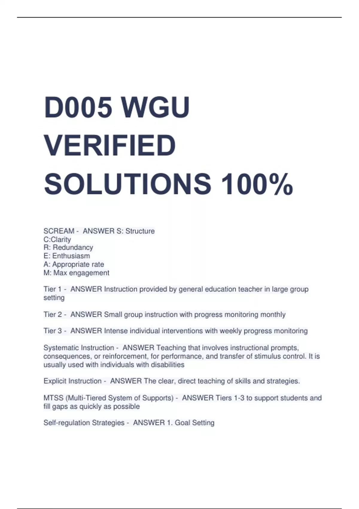 D005 WGU VERIFIED SOLUTIONS 100% SCREAM - ANSWER S: Structure C:Clarity R: Redundancy E: Enthusiasm A: Appropriate rate M: Max engagement Tier 1 - ANSWER Instruction provided by general education teacher in large group setting Tier 2 - ANSWER Small group instruction with progress monitoring monthly Tier 3 - ANSWER Intense individual interventions with weekly progress monitoring Systematic Instruction - ANSWER Teaching that involves instructional prompts, consequences, or reinforcement, for performance, and transfer of stimulus control. It is usually used with individuals with disabilities Explicit Instruction - ANSWER The clear, direct teaching of skills and strategies. MTSS (Multi-Tiered System of Supports) - ANSWER Tiers 1-3 to support students and fill gaps as quickly as possible Self-regulation Strategies - ANSWER 1. Goal Setting 2. Self Monitoring 3. Self Talk 4. Self-reinforcement 5.Model Framework 6. Academic and behavioral strategies 4 point data - ANSWER a graph with at least 6 data point, you only use the 4 most current data points 7 taxonomies of intervention - ANSWER 1. Strength: effectiveness for specific student 2. Dosage: time and frequency 3. Alignment: does it address the students full set of academic needs 4. Attention to Transfer: cross over to classroom/generalization 5. Comprehensiveness: # of explicit instructions 6. Behavioral support: does intervention include self-regulation and executive function support? 7. Individualization- DBI Set-up for intervention - ANSWER Taxonomies 1-6 SRSD (Self-Regulated