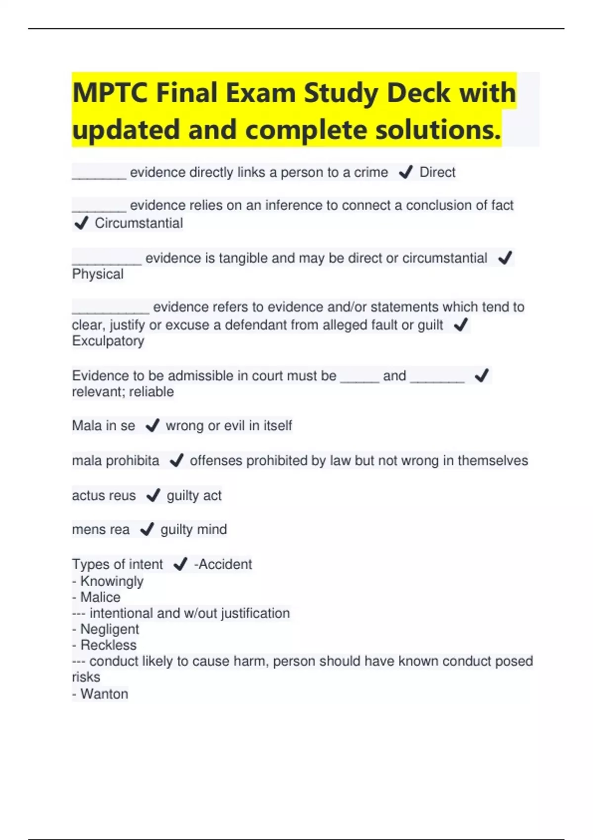 MPTC Final Exam Study Deck with updated and complete solutions | Latest 2024/2025 _______ evidence directly links a person to a crime ️ Direct _______ evidence relies on an inference to connect a conclusion of fact ️ Circumstantial _________ evidence is tangible and may be direct or circumstantial ️ Physical __________ evidence refers to evidence and/or statements which tend to clear, justify or excuse a defendant from alleged fault or guilt ️ Exculpatory Evidence to be admissible in court must be _____ and _______ ️ relevant; reliable Mala in se ️ wrong or evil in itself mala prohibita