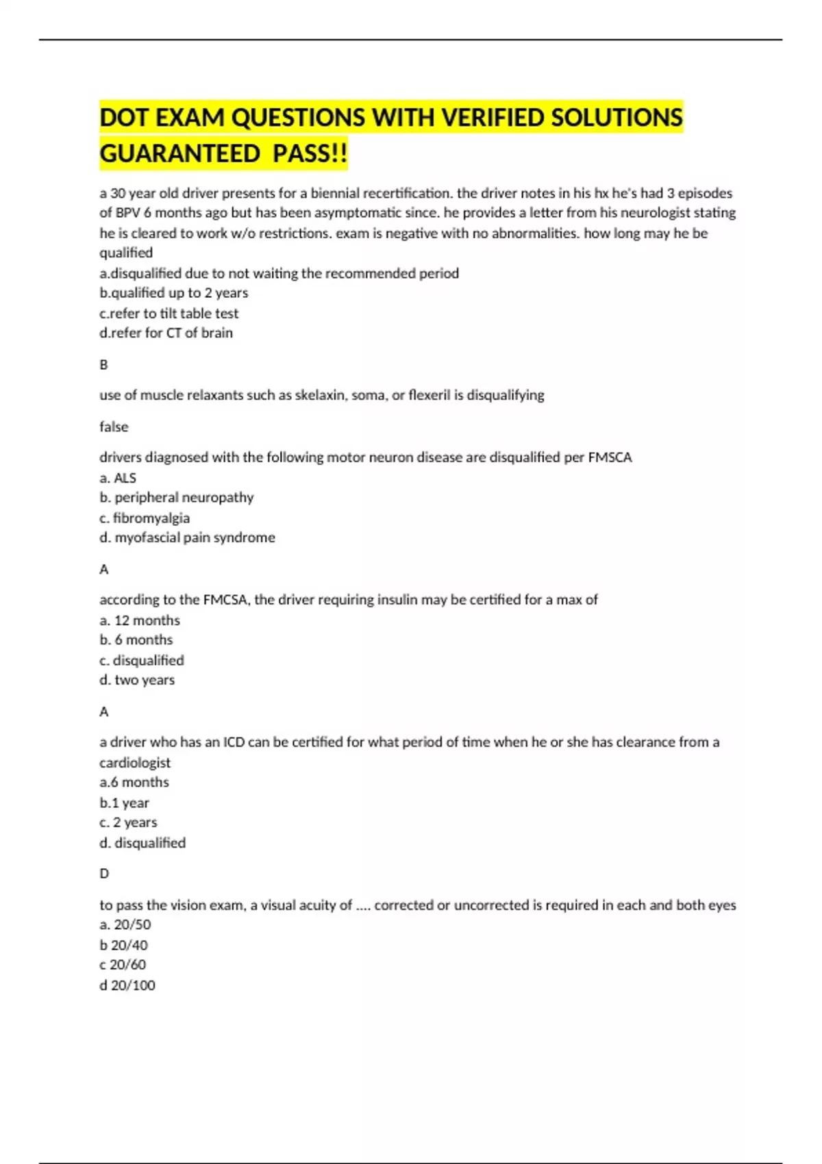 DOT EXAM QUESTIONS WITH VERIFIED SOLUTIONS GUARANTEED PASS!! a 30 year old driver presents for a biennial recertification. the driver notes in his hx he's had 3 episodes of BPV 6 months ago but has been asymptomatic since. he provides a letter from his neurologist stating he is cleared to work w/o restrictions. exam is negative with no abnormalities. how long may he be qualified alified due to not waiting the recommended period fied up to 2 years to tilt table test for CT of brain B use of muscle relaxants such as skelaxin, soma, or flexeril is disqualifying false drivers diagnosed with the following motor neuron disease are disqualified per FMSCA a. ALS b. peripheral neuropathy c. fibromyalgia d. myofascial pain syndrome A according to the FMCSA, the driver requiring insulin may be certified for a max of a. 12 months b. 6 months c. disqualified d. two years A a driver who has an ICD can be certified for what period of time when he or she has clearance from a cardiologist a.6 months b.1 year c. 2 years d. disqualified D to pass the vision exam, a visual acuity of .... corrected or uncorrected is required in each and both eyes a. 20/50 b 20/40 c 20/60 d 20/100 B what eye conditions must you ask the driver about and if indicated request a specialist? a. retinopathy b. cataracts ia d. glaucoma e. all of the above E a driver with monocular vision may apply for a federal vision exemption if they are otherwise medically qualified true examiner can only certify a driver with corrective lenses for up to 1 year per FMSCA false driver is required to have a peripheral vision of at least ... in the horizontal meridian of each eye a. 50 b.60 c.90 d.70 D which of the following providers may not certify vision results a. medical examiner b. ophthalmologist etrist logist e. all may certify D when corrective lenses are used to meet qualifications, the corrective lenses must be used while driving true the driver must be able to identify which colors in order to be medically fit? a. red e e A medical examiners have discretion when applying the vision standard to determine if a driver can be physically qualified a. true c. depends on factors C which of the following otic disease are automatically disqualifying? a. otitis media b. otitis externa c. meniere's d. BPPV C in order to pass the forced whisper test a driver must first perceive a forced whispered voice, in one ear at not less than .... a. two feet feet feet feet D to pass the audiometric test, hearing loss in one ear must be less than or equal to... a. 50 decibels b.40 decibels c.60 decibels d.80 decibels B while conducting the audiometric test, record the results at a. 500 Hz, 1000 Hz, 2000 Hz b. 600 Hz, 1200 Hz, 2000 Hz c. 100 Hz, 500 Hz, 1000 Hz d. 200 Hz, 400 Hz, 600 Hz A a hearing aide may be worn to qualify true with a prior diagnosis of BPV a driver must be symptom free for a minimum of ... months to qualify a. 3 b.6 c.2 d.12 C the examiner must conduct and record results for both the forced whisper test and audiometric test regardless of results of the first test false does the driver meet the standards for certification? audiometric results = Rt ear 30,45,40 Lt ear 45,45,35 Yes what neurological condition is not medically disqualifying a. headache psy go lepsy A for which of the following diagnosed neurological conditions is the driver considered unqualified? a. TIA greater than 1 year le seizure tia d. headache C a driver taking levodopa/carbidopa which may cause the driver to be disqualified because it treats? a. CHF b. diabetes c. parkinsons tension C the SPE certificate may be used to qualify an individual with MS false a driver has surgery for removal of an acoustic neuroma, what is the minimum waiting period a. 6 months b.1 year c.2 years d.5 years C what is the minimum recommended waiting period for viral encephalitis with early seizure a. 1 year b.2 years
