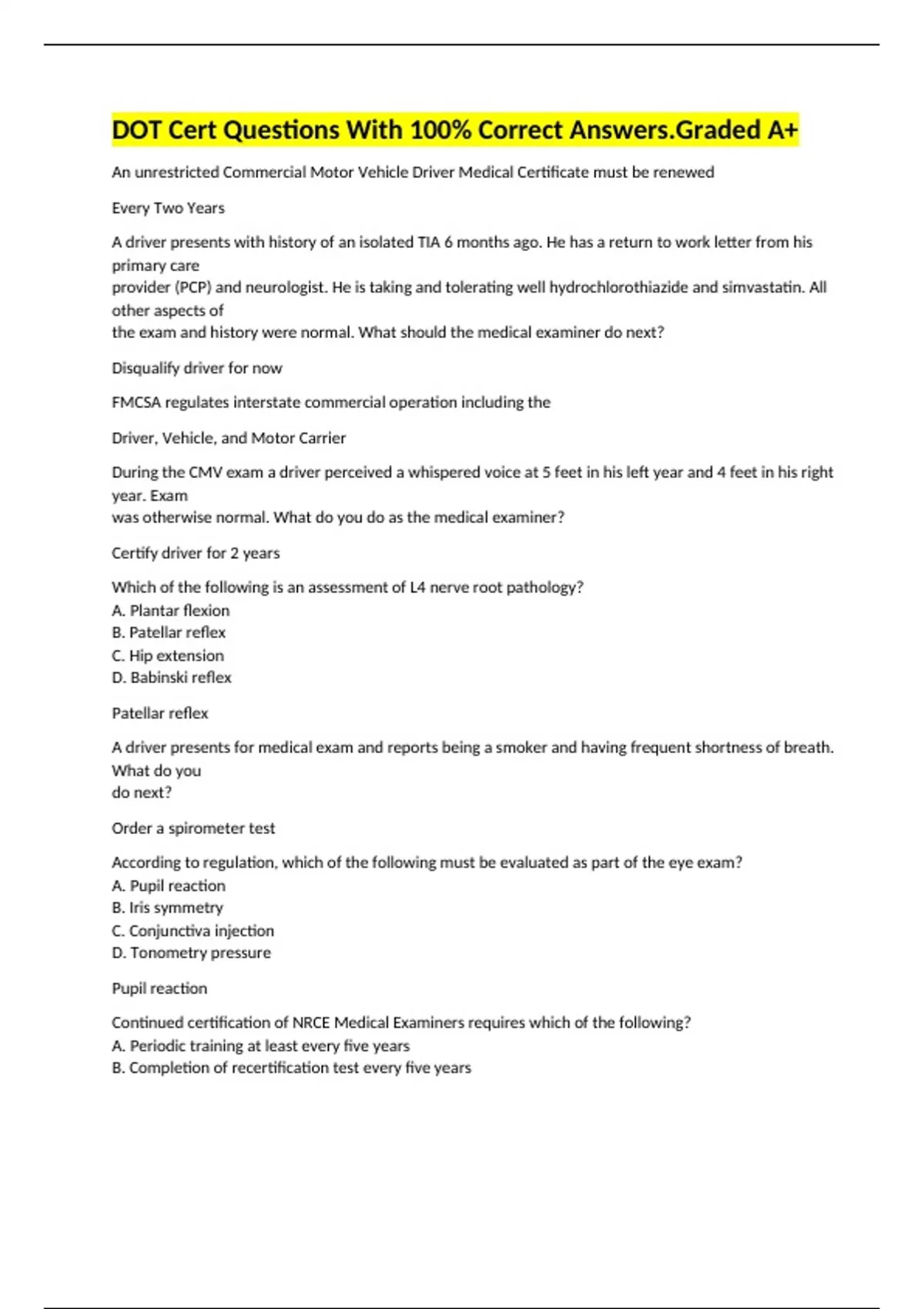 DOT Cert Questions With 100% Correct Answers.Graded A+ An unrestricted Commercial Motor Vehicle Driver Medical Certificate must be renewed Every Two Years A driver presents with history of an isolated TIA 6 months ago. He has a return to work letter from his primary care provider (PCP) and neurologist. He is taking and tolerating well hydrochlorothiazide and simvastatin. All other aspects of the exam and history were normal. What should the medical examiner do next? Disqualify driver for now FMCSA regulates interstate commercial operation including the Driver, Vehicle, and Motor Carrier During the CMV exam a driver perceived a whispered voice at 5 feet in his left year and 4 feet in his right year. Exam was otherwise normal. What do you do as the medical examiner? Certify driver for 2 years Which of the following is an assessment of L4 nerve root pathology? A. Plantar flexion B. Patellar reflex C. Hip extension D. Babinski reflex Patellar reflex A driver presents for medical exam and reports being a smoker and having frequent shortness of breath. What do you do next? Order a spirometer test According to regulation, which of the following must be evaluated as part of the eye exam? A. Pupil reaction B. Iris symmetry C. Conjunctiva injection D. Tonometry pressure Pupil reaction Continued certification of NRCE Medical Examiners requires which of the following? A. Periodic training at least every five years B. Completion of recertification test every five years C. Completion of certification test every 10 years D. Electronic transmission to FMCSA CMV Medical Examination Results at least monthly Periodic training at least every five years, Completion of certification test every 10 years, Electronic transmission to FMCSA CMV Medical Examination Results at least monthly A driver presents for recertification. The only condition he lists is GERD, for which he takes OTC omeprazole. He says that when he is driving and eating fast foods, he is more likely to have heartburn than when off‐duty. You should Correlate history with abdominal exam Which of the following findings is disqualifying? A. Oxygen saturation 90% B. LVEF 40% C. FEV 68% predicted D. All of the above Oxygen saturation 90% The driver presents for recertification and submits an ultrasound report indicating an abdominal aortic aneurysm from two months ago, shortly before he had surgical correction. He has surgical clearance and says he is doing well, has no symptoms. You should Inform the driver of the 3 month waiting period before he can be certified The driver takes diphenhydramine twice a day to treat nasal congestion. What must you document in order to certify? Cannot drive within 12 hours of taking diphenhydramine The driver has a history of carpal tunnel repair of her right hand 2 months ago. Her grip strengths are symmetrical and strong. What is necessary in order to qualify this driver? Document her findings for 2‐year certification Which of the following abdominal complaints is most likely to be incapacitating? A. IBS B. GERD C. Urinary tract infection D. Nephrolithiasis Nephrolithiasis The waiting period for benign positional vertigo is 2 months The driver's BP is 148/96. You verify her history, which indicates she has no prior history of hypertension. If otherwise qualified, you may certify her for 1 year The driver's current BP is 135/76. Your records indicate at history of Stage III hypertension 4 years ago. The maximum certification for this driver is 6 months The driver presents for examination with a recent history (five weeks ago) of pneumothorax. He has no prior history of pneumothorax. In order to be considered medically qualified, his forced vital capacity (FVC) should be greater than 65% The recommended waiting period (WP) and certification period (CP) for a driver following surgical correction for intermittent claudication are WP 3 months, CP 1 year Which of the following are disqualifying? A. Pacemaker B. Implanted defibrillator C. Both a and b D. Neither Implanted defibrillator Five years post‐CABG, the driver must provide a copy of _________ in order to qualify for recertification ETT The driver has a 5‐year history of asthma, described as "well‐controlled". He carries rescue inhaler for the times when he becomes short of breath, but says this is rare. He provides pulmonary functions performed last week and his FEV1 is 62% of predicted and his Pa02 is 62 mm. You should Disqualify and recommend that he return to his personal provider What is the Primary mission of FMCSA? To promote the safety of the roadways. During a driver's history, she describes her role and responsibilities as limited to the driving component and excluding strenuous activities. You should Conduct the full and standard physical examination During the examination, a driver reveals, "I had a touch of sugar" two years ago, but stopped taking the prescribed medication when it ran out, the name of which was forgotten. Driver did not indicate "yes" on the medical history for diabetes. The examination and urinalysis are unremarkable. What is the appropriate action you would take to complete this examination? Correct the medical history in your narrative and discuss the signs, symptoms and health impact of diabetes and the need for regular follow‐up in certifying the driver Which of the following tests is recommended as medical guidance for initial pulmonary function testing? A. Forced expiratory volume in 1 second (FEV1) B. Peak flow spirometry, best effort C. Forced vital capacity (FVC) D. FEV1/FVC ratio Forced expiratory volume in 1 second (FEV1), Forced vital capacity (FVC), FEV1/FVC ratio A 60 year old driver reveals a 6 month history of progressive worsening of dizziness and ringing in the ears. It is worse when he bends over. He denies hearing loss, no trauma or recent infections, and takes no chronic medications, but was told by another driver to try meclizine. He did try and it seemed to help. Which of the following routine screen