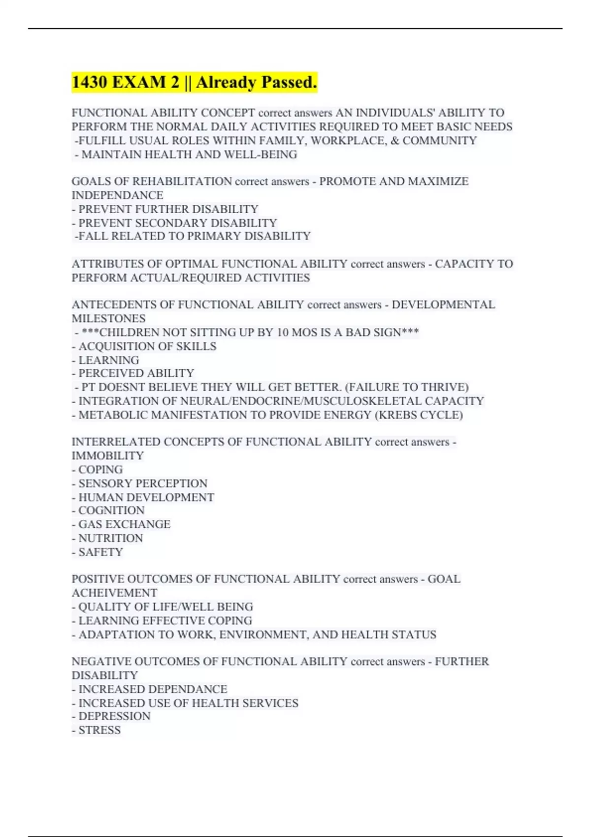 FUNCTIONAL ABILITY CONCEPT correct answers AN INDIVIDUALS' ABILITY TO PERFORM THE NORMAL DAILY ACTIVITIES REQUIRED TO MEET BASIC NEEDS -FULFILL USUAL ROLES WITHIN FAMILY, WORKPLACE, & COMMUNITY - MAINTAIN HEALTH AND WELL-BEING GOALS OF REHABILITATION correct answers - PROMOTE AND MAXIMIZE INDEPENDANCE - PREVENT FURTHER DISABILITY - PREVENT SECONDARY DISABILITY -FALL RELATED TO PRIMARY DISABILITY ATTRIBUTES OF OPTIMAL FUNCTIONAL ABILITY correct answers - CAPACITY TO PERFORM ACTUAL/REQUIRED ACTIVITIES ANTECEDENTS OF FUNCTIONAL ABILITY correct answers - DEVELOPMENTAL MILESTONES - ***CHILDREN NOT SITTING UP BY 10 MOS IS A BAD SIGN*** - ACQUISITION OF SKILLS - LEARNING - PERCEIVED ABILITY - PT DOESNT BELIEVE THEY WILL GET BETTER. (FAILURE TO THRIVE) - INTEGRATION OF NEURAL/ENDOCRINE/MUSCULOSKELETAL CAPACITY - METABOLIC MANIFESTATION TO PROVIDE ENERGY (KREBS CYCLE) INTERRELATED CONCEPTS OF FUNCTIONAL ABILITY correct answers - IMMOBILITY - COPING - SENSORY PERCEPTION - HUMAN DEVELOPMENT - COGNITION - GAS EXCHANGE - NUTRITION - SAFETY POSITIVE OUTCOMES OF FUNCTIONAL ABILITY correct answers - GOAL ACHEIVEMENT - QUALITY OF LIFE/WELL BEING - LEARNING EFFECTIVE COPING - ADAPTATION TO WORK, ENVIRONMENT, AND HEALTH STATUS NEGATIVE OUTCOMES OF FUNCTIONAL ABILITY correct answers - FURTHER DISABILITY - INCREASED DEPENDANCE - INCREASED USE OF HEALTH SERVICES - DEPRESSION - STRESS