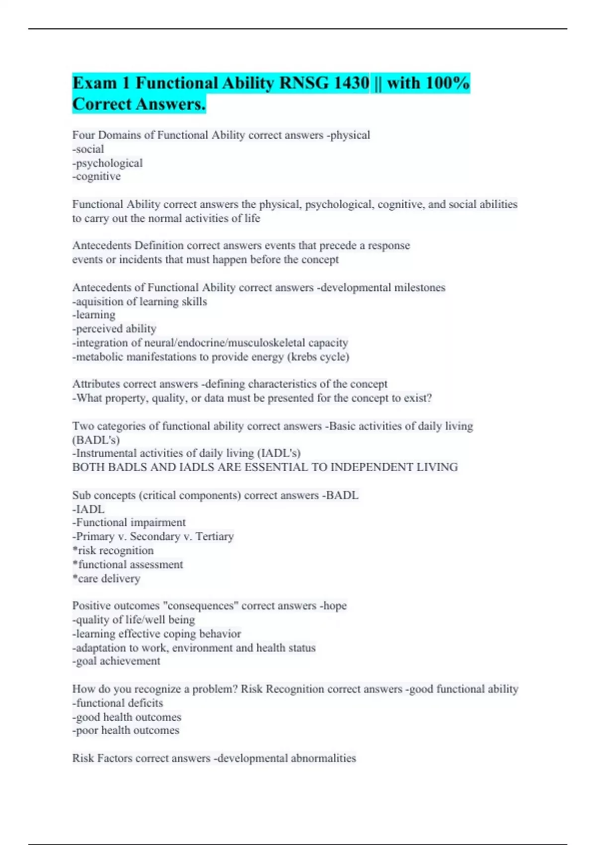 Four Domains of Functional Ability correct answers -physical -social -psychological -cognitive Functional Ability correct answers the physical, psychological, cognitive, and social abilities to carry out the normal activities of life Antecedents Definition correct answers events that precede a response events or incidents that must happen before the concept Antecedents of Functional Ability correct answers -developmental milestones -aquisition of learning skills -learning -perceived ability -integration of neural/endocrine/musculoskeletal capacity -metabolic manifestations to provide energy (krebs cycle) Attributes correct answers -defining characteristics of the concept -What property, quality, or data must be presented for the concept to exist? Two categories of functional ability correct answers -Basic activities of daily living (BADL's) -Instrumental activities of daily living (IADL's) BOTH BADLS AND IADLS ARE ESSENTIAL TO INDEPENDENT LIVING Sub concepts (critical components) correct answers -BADL -IADL -Functional impairment -Primary v. Secondary v. Tertiary *risk recognition *functional assessment *care delivery Positive outcomes "consequences" correct answers -hope -quality of life/well being -learning effective coping behavior -adaptation to work, environment and health status -goal achievement How do you recognize a problem? Risk Recognition correct answers -good functional ability -functional deficits -good health outcomes -poor health outcomes Risk Factors correct answers -developmental abnormalities