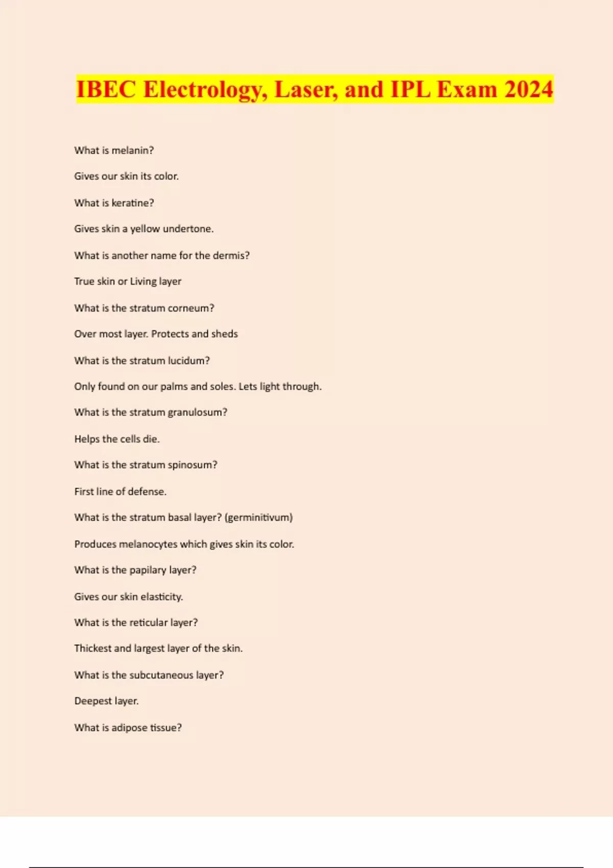 IBEC Electrology, Laser, and IPL Exam 2024 What is melanin? Gives our skin its color. What is keratine? Gives skin a yellow undertone. What is another name for the dermis? True skin or Living layer What is the stratum corneum? Over most layer. Protects and sheds What is the stratum lucidum? Only found on our palms and soles. Lets light through. What is the stratum granulosum? Helps the cells die. What is the stratum spinosum? First line of defense. What is the stratum basal layer? (germinitivum) Produces melanocytes which gives skin its color. What is the papilary layer? Gives our skin elasticity. What is the reticular layer? Thickest and largest layer of the skin. What is the subcutaneous layer? Deepest layer. What is adipose tissue?