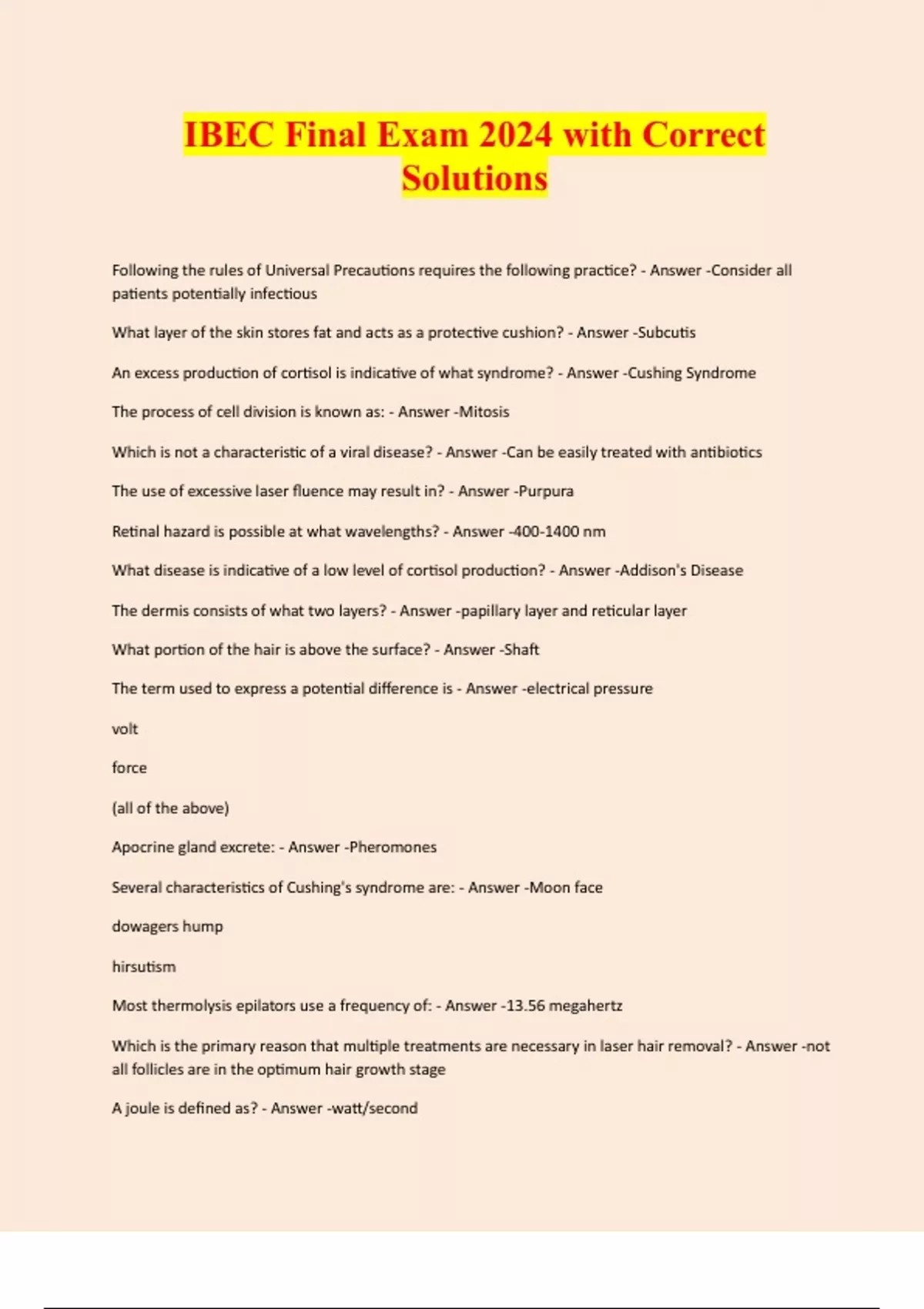 IBEC Final Exam 2024 with Correct Solutions Following the rules of Universal Precautions requires the following practice? - Answer -Consider all patients potentially infectious What layer of the skin stores fat and acts as a protective cushion? - Answer -Subcutis An excess production of cortisol is indicative of what syndrome? - Answer -Cushing Syndrome The process of cell division is known as: - Answer -Mitosis Which is not a characteristic of a viral disease? - Answer -Can be easily treated with antibiotics The use of excessive laser fluence may result in? - Answer -Purpura Retinal hazard is possible at what wavelengths? - Answer -400-1400 nm What disease is indicative of a low level of cortisol production? - Answer -Addison's Disease The dermis consists of what two layers? - Answer -papillary layer and reticular layer What portion of the hair is above the surface? - Answer -Shaft The term used to express a potential difference is - Answer -electrical pressure volt force (all of the above) Apocrine gland excrete: - Answer -Pheromones Several characteristics of Cushing's syndrome are: - Answer -Moon face dowagers hump hirsutism Most thermolysis epilators use a frequency of: - Answer -13.56 megahertz Which is the primary reason that multiple treatments are necessary in laser hair removal? - Answer -not all follicles are in the optimum hair growth stage A joule is defined as? - Answer -watt/second