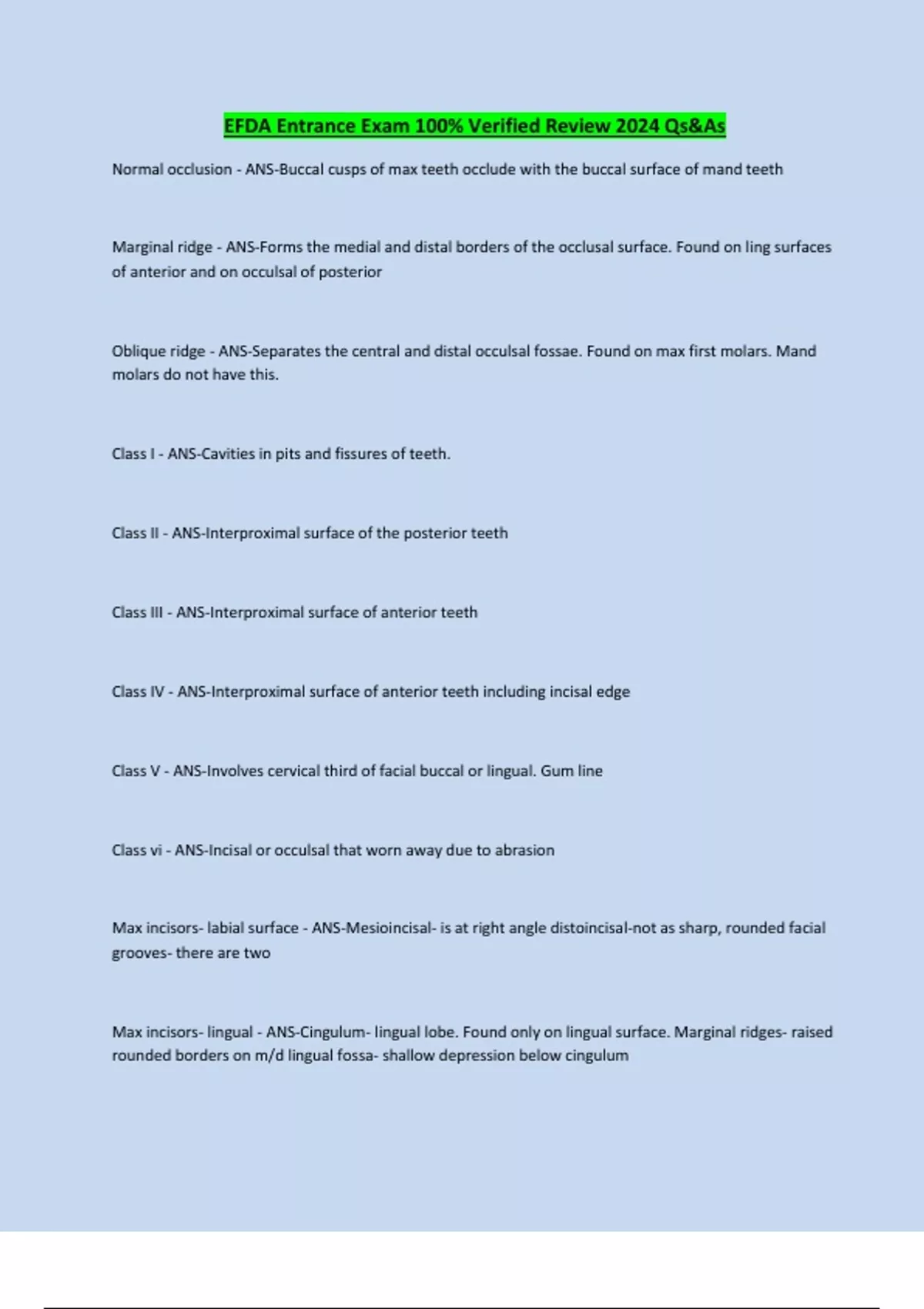 EFDA Entrance Exam 100% Verified Review 2024 Qs&As