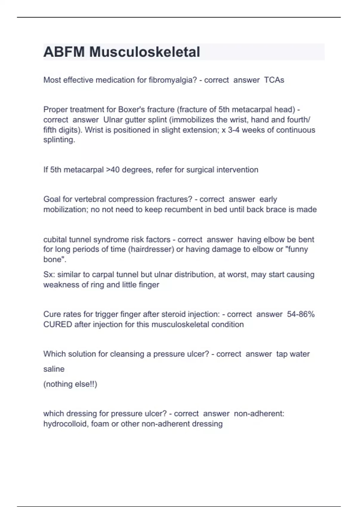 ABFM MusculoskeletalMost effective medication for fibromyalgia? - correct answer TCAs Proper treatment for Boxer's fracture (fracture of 5th metacarpal head) - correct answer Ulnar gutter splint (immobilizes the wrist, hand and fourth/ fifth digits). Wrist is positioned in slight extension; x 3-4 weeks of continuous splinting. If 5th metacarpal >40 degrees, refer for surgical intervention Goal for vertebral compression fractures? - correct answer early mobilization; no not need to keep recumbent in bed until back brace is made cubital tunnel syndrome risk factors - correct answer having elbow be bent for long periods of time (hairdresser) or having damage to elbow or "funny bone". Sx: similar to carpal tunnel but ulnar distribution, at worst, may start causing weakness of ring and little finger Cure rates for trigger finger after steroid injection: - correct answer 54-86% CURED after injection for this musculoskeletal condition Which solution for cleansing a pressure ulcer? - correct answer tap water saline (nothing else!!) which dressing for pressure ulcer? - correct answer non-adherent: hydrocolloid, foam or other non-adherent dressing