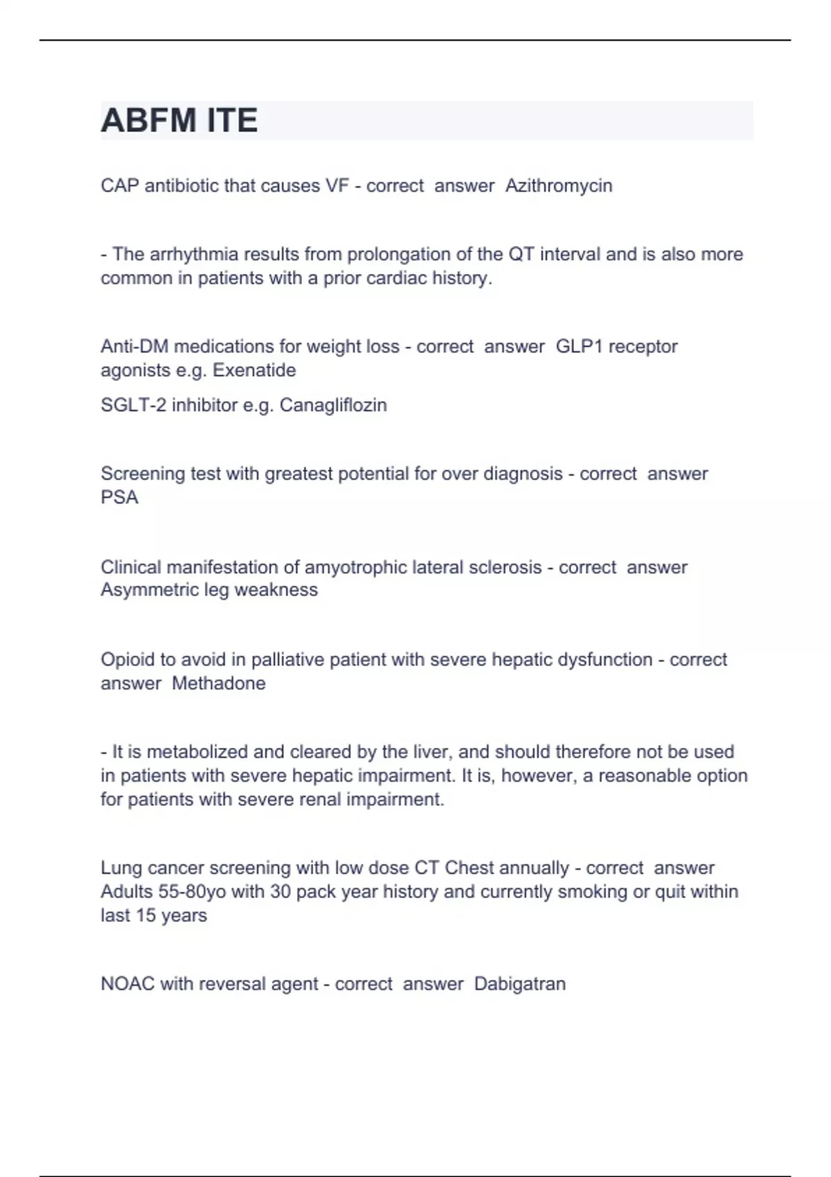 ABFM ITECAP antibiotic that causes VF - correct answer Azithromycin - The arrhythmia results from prolongation of the QT interval and is also more common in patients with a prior cardiac history. Anti-DM medications for weight loss - correct answer GLP1 receptor agonists e.g. Exenatide SGLT-2 inhibitor e.g. Canagliflozin Screening test with greatest potential for over diagnosis - correct answer PSA Clinical manifestation of amyotrophic lateral sclerosis - correct answer Asymmetric leg weakness Opioid to avoid in palliative patient with severe hepatic dysfunction - correct answer Methadone - It is metabolized and cleared by the liver, and should therefore not be used in patients with severe hepatic impairment. It is, however, a reasonable option for patients with severe renal impairment. Lung cancer screening with low dose CT Chest annually - correct answer Adults 55-80yo with 30 pack year history and currently smoking or quit within last 15 years NOAC with reversal agent - correct answer Dabigatran Reduces alcoholism but creating an acute ethanol sensitivity - correct answer Disulfiram Antidepressant to be avoided in the elderly - correct answer Paroxetine (associated with more anticholinergic effects) SSRIs > SNRIs, atypical antipsychotics may be added for resistant depression Age group between which American Academy of Pediatrics recommends administration of an autism-specific screening tool - correct answer 18-24 months old Most common neurological complication of Paget's disease of the bone - correct answer Most common cardiac complication of Lyme disease - correct answer Heart blocks Examination finding of those with bacterial vaginosis - correct answer Vaginal pH >4.5 (normal vaginal pH should be acidic) Most common cause of medication-related adverse events across health care settings in the United States - correct answer Antibiotics Screening for asymptomatic carotid artery stenosis - correct answer Not recommended