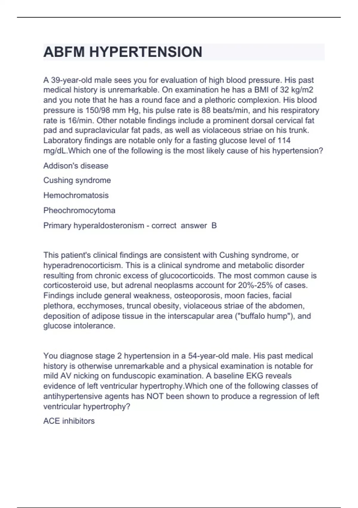 ABFM HYPERTENSIONA 39-year-old male sees you for evaluation of high blood pressure. His past medical history is unremarkable. On examination he has a BMI of 32 kg/m2 and you note that he has a round face and a plethoric complexion. His blood pressure is 150/98 mm Hg, his pulse rate is 88 beats/min, and his respiratory rate is 16/min. Other notable findings include a prominent dorsal cervical fat pad and supraclavicular fat pads, as well as violaceous striae on his trunk. Laboratory findings are notable only for a fasting glucose level of 114 mg/dL.Which one of the following is the most likely cause of his hypertension? Addison's disease Cushing syndrome Hemochromatosis Pheochromocytoma Primary hyperaldosteronism - correct answer B This patient's clinical findings are consistent with Cushing syndrome, or hyperadrenocorticism. This is a clinical syndrome and metabolic disorder resulting from chronic excess of glucocorticoids. The most common cause is corticosteroid use, but adrenal neoplasms account for 20%-25% of cases. Findings include general weakness, osteoporosis, moon facies, facial plethora, ecchymoses, truncal obesity, violaceous striae of the abdomen, deposition of adipose tissue in the interscapular area ("buffalo hump"), and glucose intolerance. You diagnose stage 2 hypertension in a 54-year-old male. His past medical history is otherwise unremarkable and a physical examination is notable for mild AV nicking on funduscopic examination. A baseline EKG reveals evidence of left ventricular hypertrophy.Which one of the following classes of antihypertensive agents has NOT been shown to produce a regression of left ventricular hypertrophy? ACE inhibitors