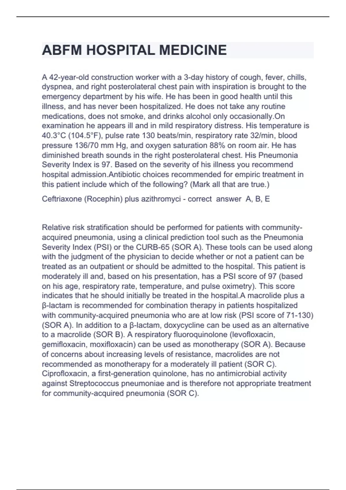 ABFM HOSPITAL MEDICINEA 42-year-old construction worker with a 3-day history of cough, fever, chills, dyspnea, and right posterolateral chest pain with inspiration is brought to the emergency department by his wife. He has been in good health until this illness, and has never been hospitalized. He does not take any routine medications, does not smoke, and drinks alcohol only occasionally.On examination he appears ill and in mild respiratory distress. His temperature is 40.3°C (104.5°F), pulse rate 130 beats/min, respiratory rate 32/min, blood pressure 136/70 mm Hg, and oxygen saturation 88% on room air. He has diminished breath sounds in the right posterolateral chest. His Pneumonia Severity Index is 97. Based on the severity of his illness you recommend hospital admission.Antibiotic choices recommended for empiric treatment in this patient include which of the following? (Mark all that are true.) Ceftriaxone (Rocephin) plus azithromyci - correct answer A, B, E Relative risk stratification should be performed for patients with community-acquired pneumonia, using a clinical prediction tool such as the Pneumonia Severity Index (PSI) or the CURB-65 (SOR A). These tools can be used along with the judgment of the physician to decide whether or not a patient can be treated as an outpatient or should be admitted to the hospital. This patient is moderately ill and, based on his presentation, has a PSI score of 97 (based on his age, respiratory rate, temperature, and pulse oximetry). This score indicates that he should initially be treated in the hospital.A macrolide plus a β-lactam is recommended for combination therapy in patients hospitalized with community-acquired pneumonia who are at low risk (PSI score of 71-130) (SOR A). In addition to a β-lactam, doxycycline can be used as an alternative to a macrolide (SOR B). A respiratory fluoroquinolone (levofloxacin, gemifloxacin, moxifloxacin) can be used as monotherapy (SOR A). Because of concerns about increasing levels of resistance, macrolides are not recommended as monotherapy for a moderately ill patient (SOR C). Ciprofloxacin, a first-generation quinolone, has no antimicrobial activity against Streptococcus pneumoniae and is therefore not appropriate treatment for community-acquired pneumonia (SOR C).