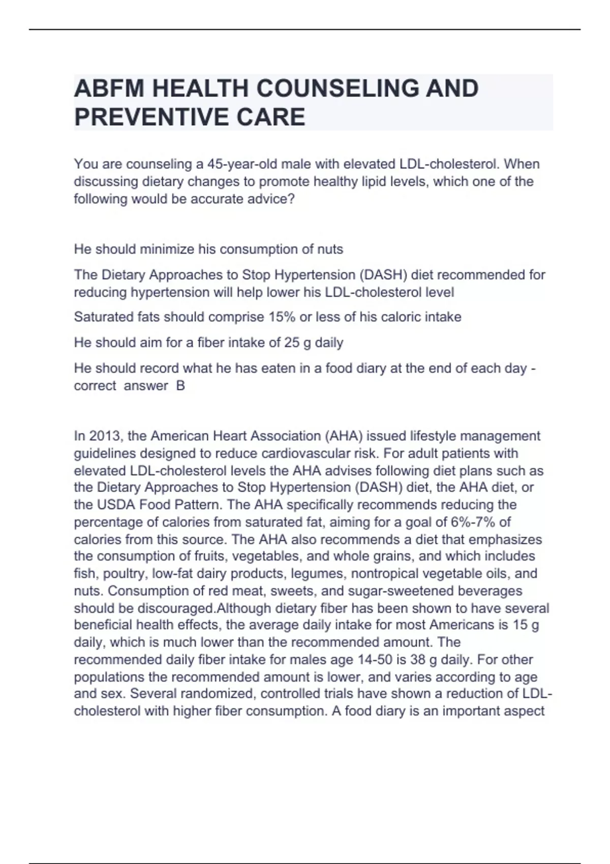 ABFM HEALTH COUNSELING AND PREVENTIVE CAREYou are counseling a 45-year-old male with elevated LDL-cholesterol. When discussing dietary changes to promote healthy lipid levels, which one of the following would be accurate advice? He should minimize his consumption of nuts The Dietary Approaches to Stop Hypertension (DASH) diet recommended for reducing hypertension will help lower his LDL-cholesterol level Saturated fats should comprise 15% or less of his caloric intake He should aim for a fiber intake of 25 g daily He should record what he has eaten in a food diary at the end of each day - correct answer B In 2013, the American Heart Association (AHA) issued lifestyle management guidelines designed to reduce cardiovascular risk. For adult patients with elevated LDL-cholesterol levels the AHA advises following diet plans such as the Dietary Approaches to Stop Hypertension (DASH) diet, the AHA diet, or the USDA Food Pattern. The AHA specifically recommends reducing the percentage of calories from saturated fat, aiming for a goal of 6%-7% of calories from this source. The AHA also recommends a diet that emphasizes the consumption of fruits, vegetables, and whole grains, and which includes fish, poultry, low-fat dairy products, legumes, nontropical vegetable oils, and nuts. Consumption of red meat, sweets, and sugar-sweetened beverages should be discouraged.Although dietary fiber has been shown to have several beneficial health effects, the average daily intake for most Americans is 15 g daily, which is much lower than the recommended amount. The recommended daily fiber intake for males age 14-50 is 38 g daily. For other populations the recommended amount is lower, and varies according to age and sex. Several randomized, controlled trials have shown a reduction of LDL-cholesterol with higher fiber consumption. A food diary is an important aspect of dietary behavior change but it is most accurate if entries are made immediately after food is consumed. A 24-year-old female sees you for a preconception visit and removal of her IUD. This will be her first pregnancy and she tells you that she has smoked ¼-½ pack of cigarettes a day for the past 5 years.Which one of the following would be appropriate advice regarding the risks from smoking? Smoking during pregnancy increases the risk of attention-deficit/hyperactivity disorder Smoking during pregnancy increases the risk of clubfoot Smoking during pregnancy increases the risk of congenital atrial septal defects Stopping smoking now will reduce the increased risk of orofacial defects in her infant Reducing smoking now will reduce the risk of preterm delivery - correct answer D There are many reproductive problems related to smoking, including conception delay and both primary and secondary infertility; an increased risk of ectopic pregnancy and spontaneous abortion; an increased risk of abruption, preterm rupture of membranes, placenta previa, and premature delivery; and increased perinatal morbidity and mortality, including stillbirth, low birth weight, and SIDS-related deaths. The 2001 Surgeon General's Report on women and smoking makes it clear that stopping smoking during pregnancy reduces and sometimes eliminates many of these consequences.Small for gestational age (SGA) infants are a dose-dependent outcome of maternal smoking, with an odds ratio (OR) of 2.11 when women smoke throughout pregnancy. Risks for prematurity (OR 1.15) and fetal death (OR 1.15) are also increased. The risk of having an SGA infant is avoided if smoking is reduced, but the risks for prematurity and increased fetal death are not.In 2014 the U.S. Surgeon General issued a new report on the health consequences of smoking that noted that the evidence was strong enough to
