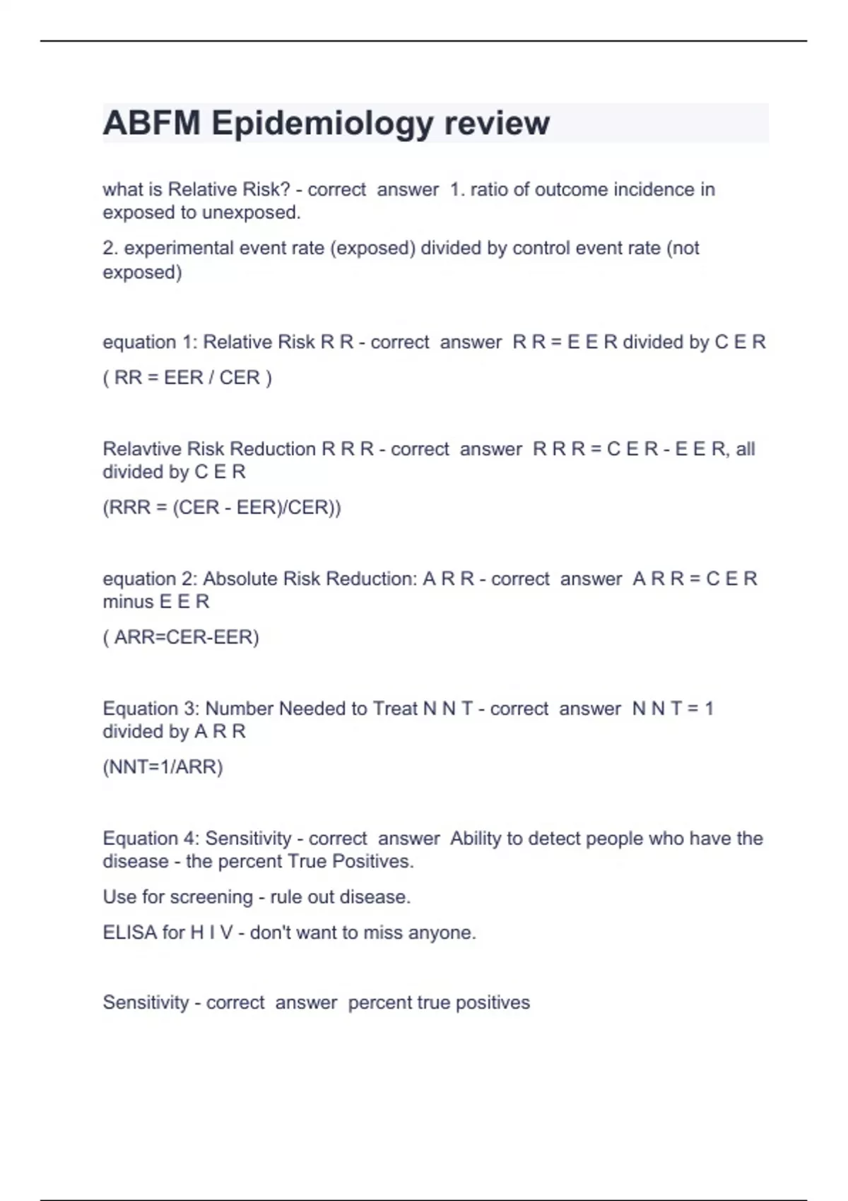 ABFM Epidemiology reviewwhat is Relative Risk? - correct answer 1. ratio of outcome incidence in exposed to unexposed. 2. experimental event rate (exposed) divided by control event rate (not exposed) equation 1: Relative Risk R R - correct answer R R = E E R divided by C E R ( RR = EER / CER ) Relavtive Risk Reduction R R R - correct answer R R R = C E R - E E R, all divided by C E R (RRR = (CER - EER)/CER)) equation 2: Absolute Risk Reduction: A R R - correct answer A R R = C E R minus E E R ( ARR=CER-EER) Equation 3: Number Needed to Treat N N T - correct answer N N T = 1 divided by A R R (NNT=1/ARR) Equation 4: Sensitivity - correct answer Ability to detect people who have the disease - the percent True Positives. Use for screening - rule out disease. ELISA for H I V - don't want to miss anyone. Sensitivity - correct answer percent true positives