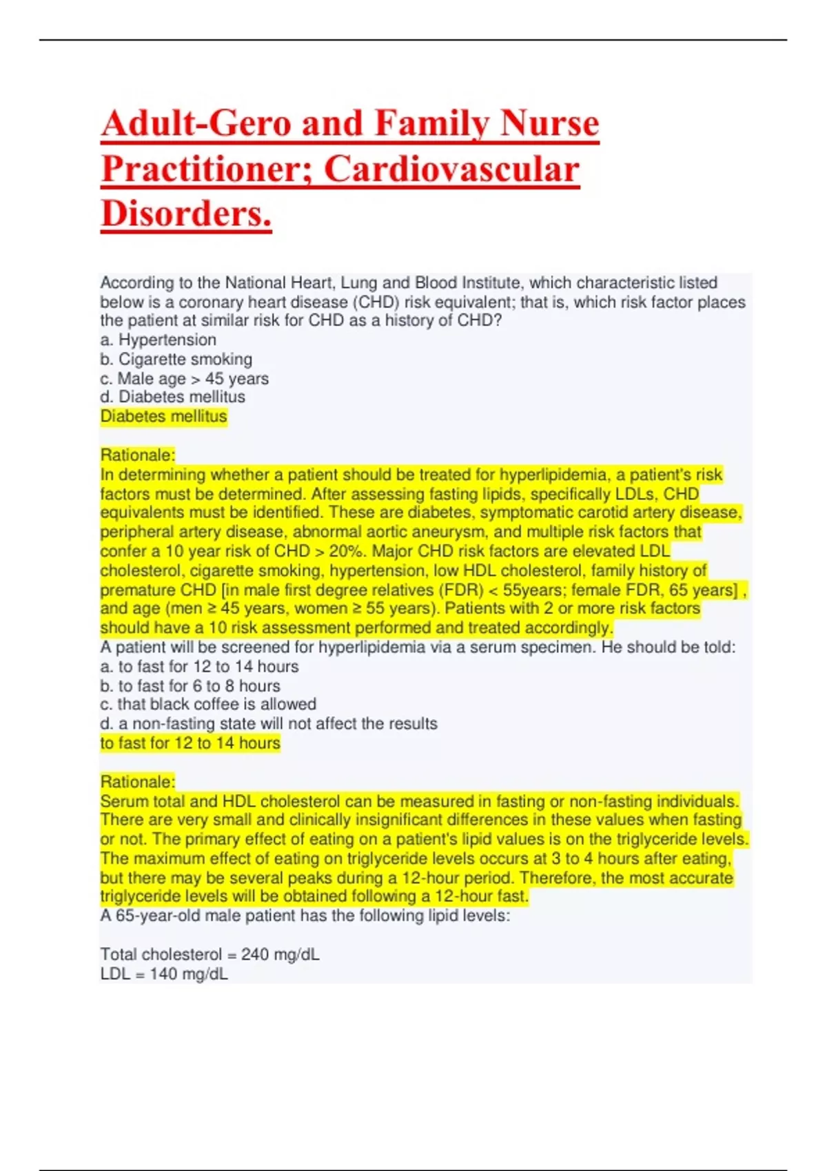 d. Diabetes mellitus Diabetes mellitus Rationale: In determining whether a patient should be treated for hyperlipidemia, a patient's risk factors must be determined. After assessing fasting lipids, specifically LDLs, CHD equivalents must be identified. These are diabetes, symptomatic carotid artery disease, peripheral artery disease, abnormal aortic aneurysm, and multiple risk factors that confer a 10 year risk of CHD 20%. Major CHD risk factors are elevated LDL cholesterol, cigarette smoking, hypertension, low HDL cholesterol, family history of premature CHD [in male first degree relatives (FDR) 55years; female FDR, 65 years] , and age (men ≥ 45 years, women ≥ 55 years). Patients with 2 or more risk factors should have a 10 risk assessment performed and treated accordingly. A patient will be screened for hyperlipidemia via a serum specimen. He should be told: a. to fast for 12 to 14 hours b. to fast for 6 to 8 hours c. that black coffee is allowed d. a non-fasting state will not affect the results to fast for 12 to 14 hours Rationale: Serum total and HDL cholesterol can be measured in fasting or non-fasting individuals. There are very small and clinically insignificant differences in these values when fasting or not. The primary effect of eating on a patient's lipid values is on the triglyceride levels. The maximum effect of eating on triglyceride levels occurs at 3 to 4 hours after eating, but there may be several peaks during a 12-hour period. Therefore, the most accurate triglyceride levels will be obtained following a 12-hour fast. A 65-year-old male patient has the following lipid levels: Total cholesterol = 240 mg/dL LDL = 140 mg/dL